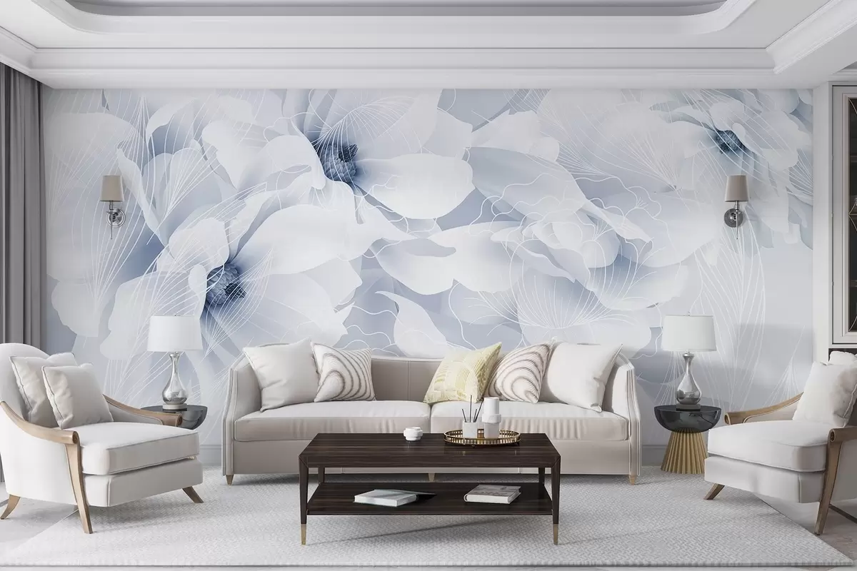 Fototapeedid Valge ja sinise õrnade kroonlehtedega pastellpuu lilled ja valged jooned helesinisel taustal Nr w08826