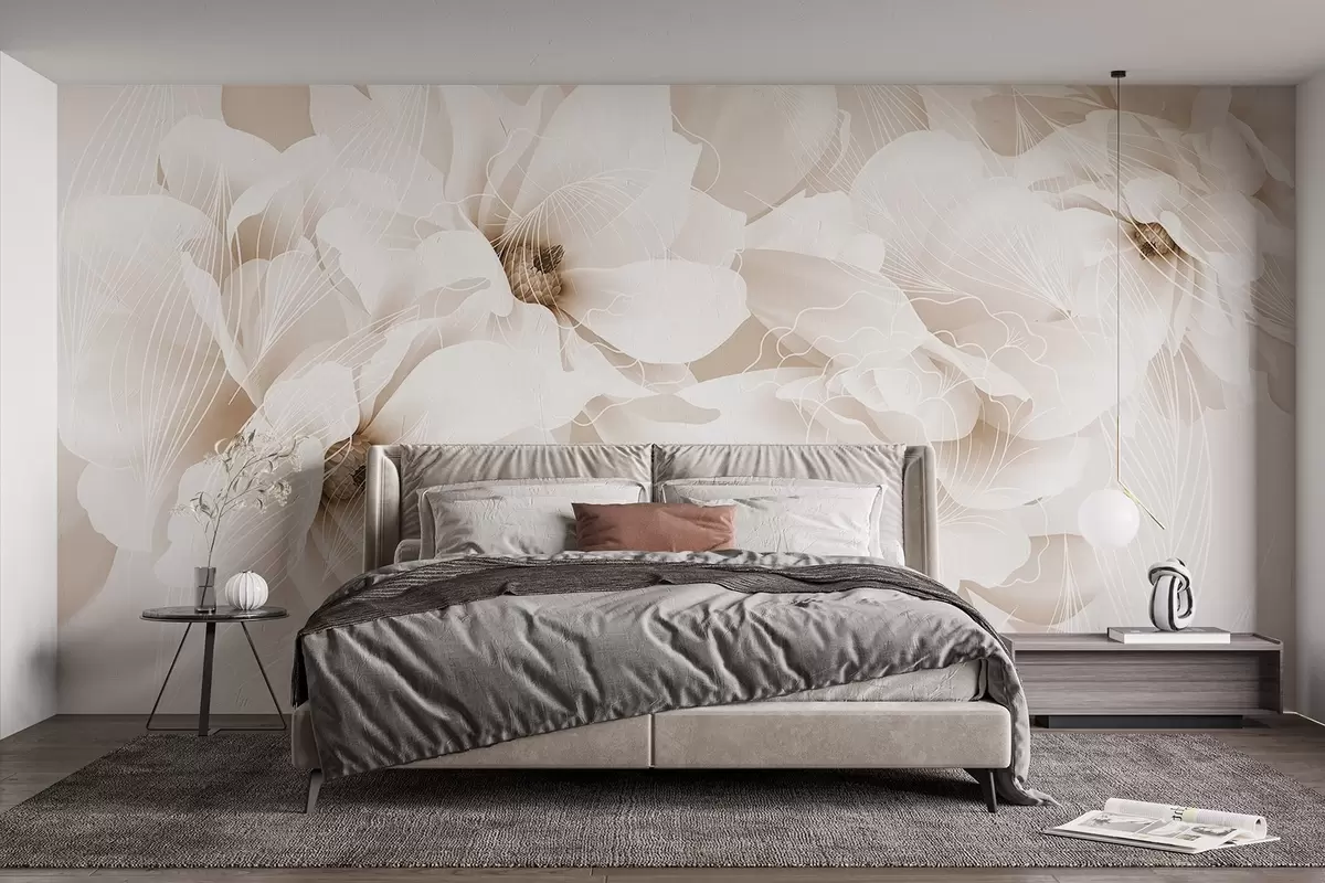 Fototapeedid Valge ja beeži õrnade kroonlehtede ja valgete joontega pastelsed pioonililled helebeezil taustal Nr w08826v1