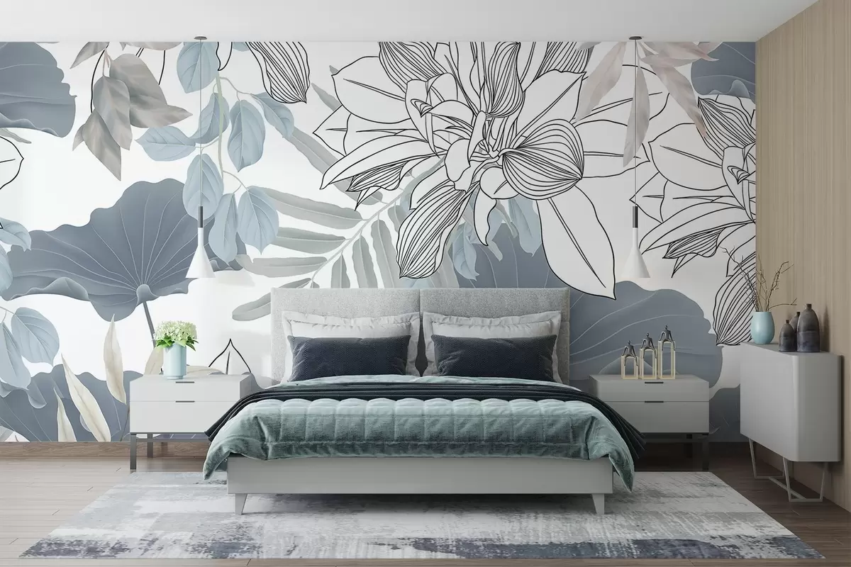 Fototapeedid Lootuslillede ja -lehtedega lilleline trükis sinise ja valge taustaga Nr w08827