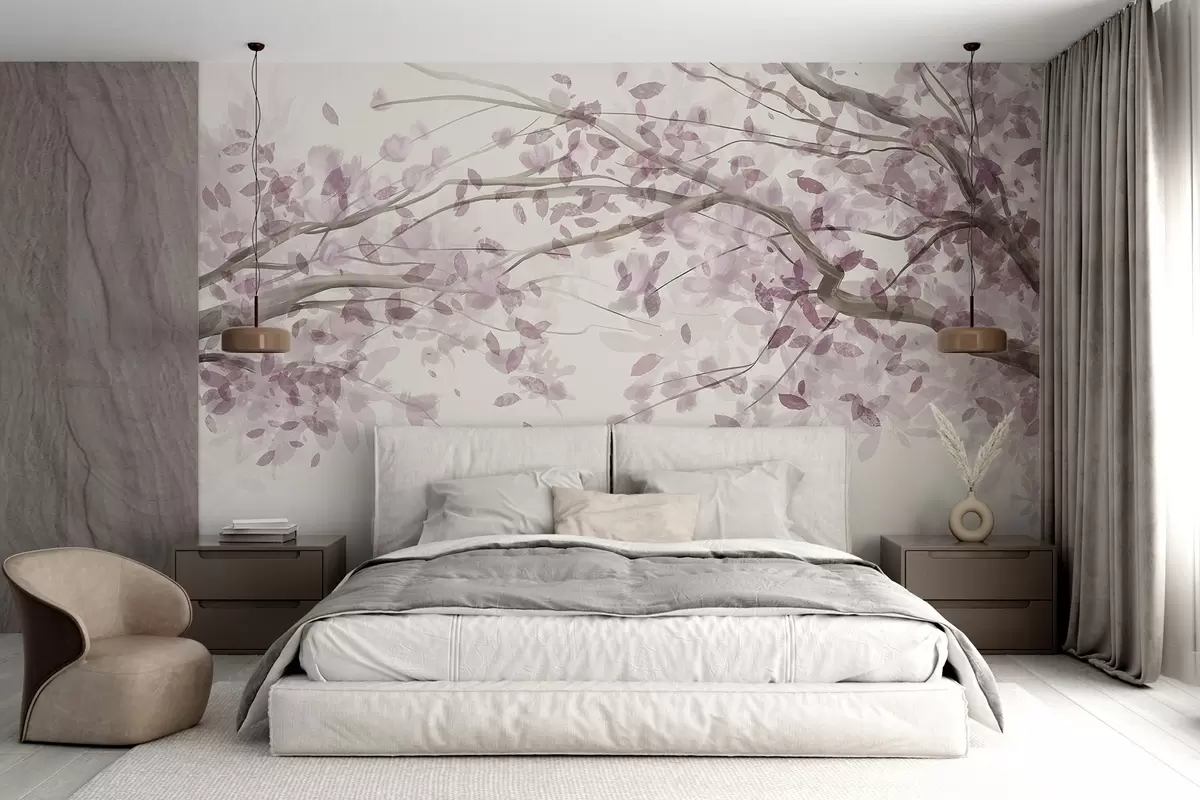 Fototapeedid Õie oksad roosade lehtedega, pehmed värvid, õrnad detailid, akvarellstiilis, heledal taustal Nr w08867