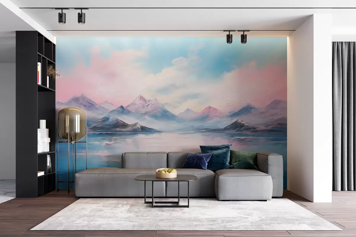 Fototapeedid Värviline pintslitõmmete stiilis maastik roosades ja sinistes toonides, millel on mäed, järv ja pilved Nr w08878