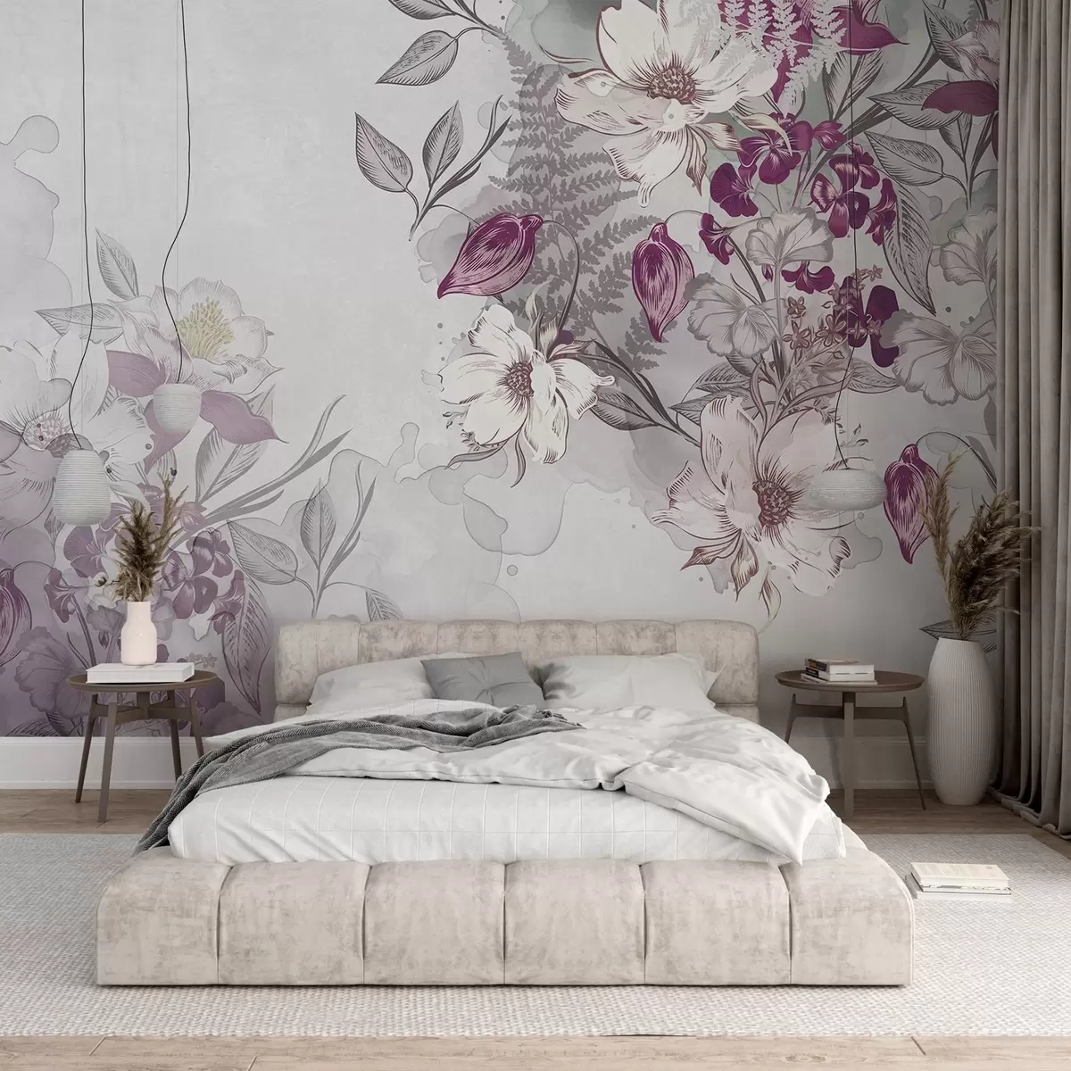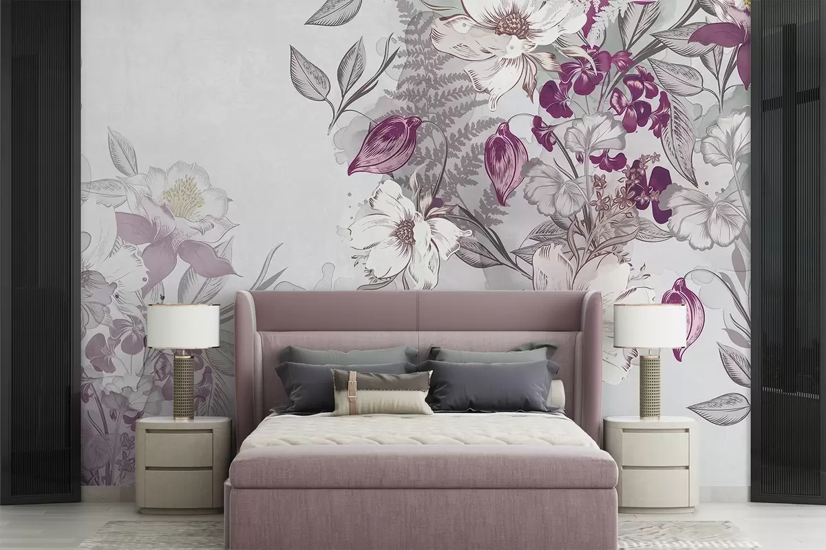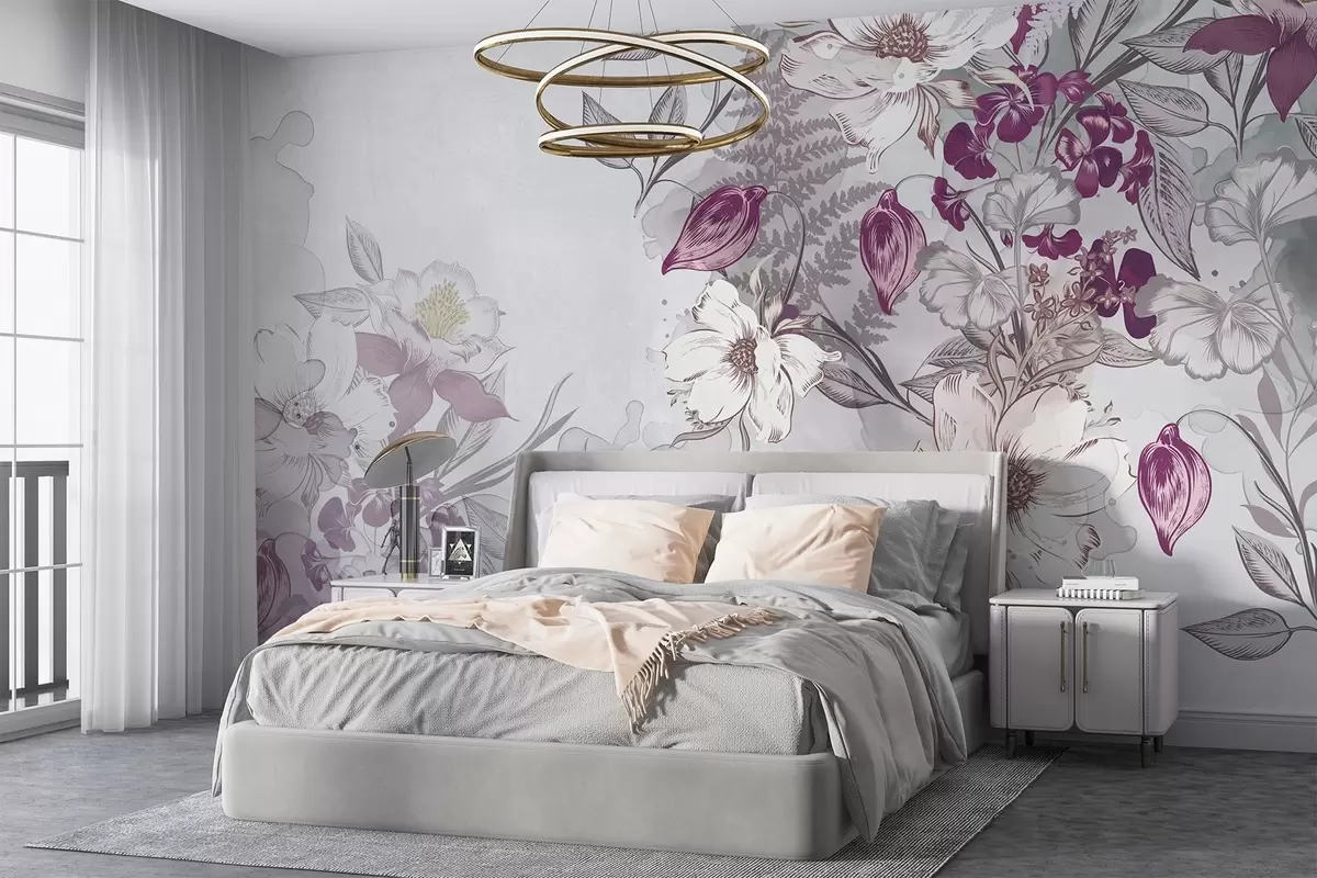 Fototapeedid Valge ja lilla kroonlehtede, lehtede ja varrega lilled , akvarelli efekt , helehall tekstuurne taust Nr w08899