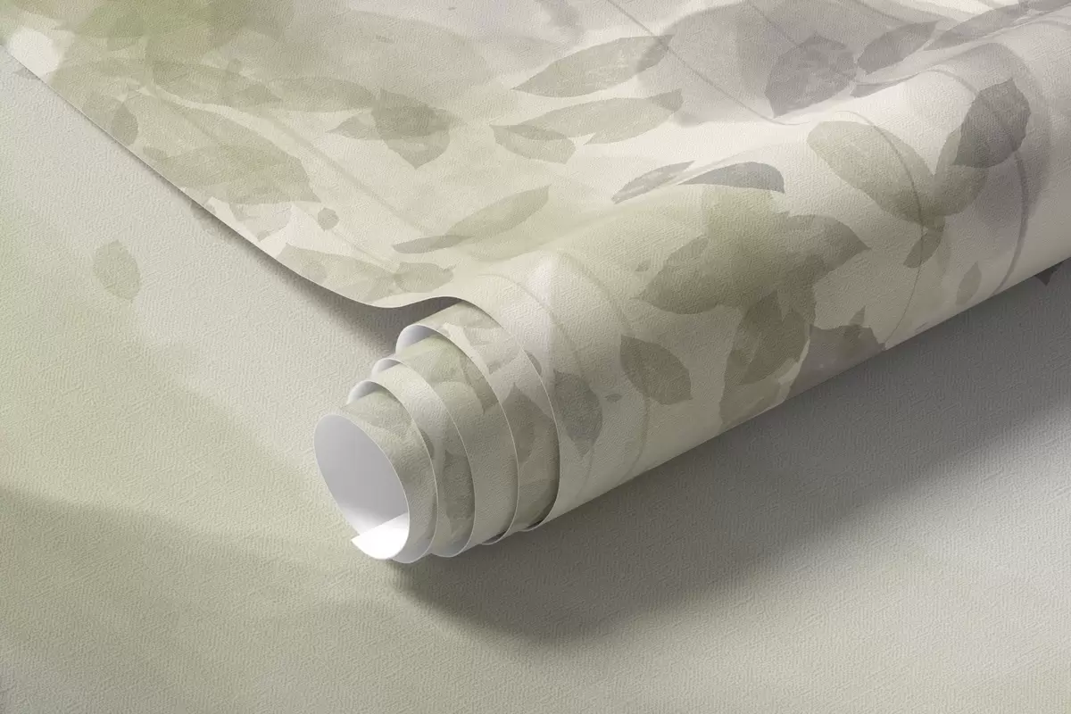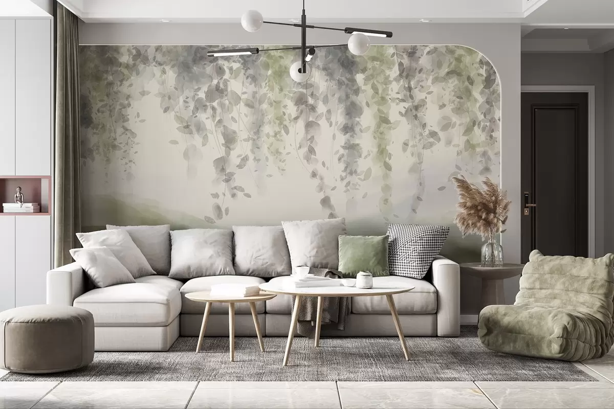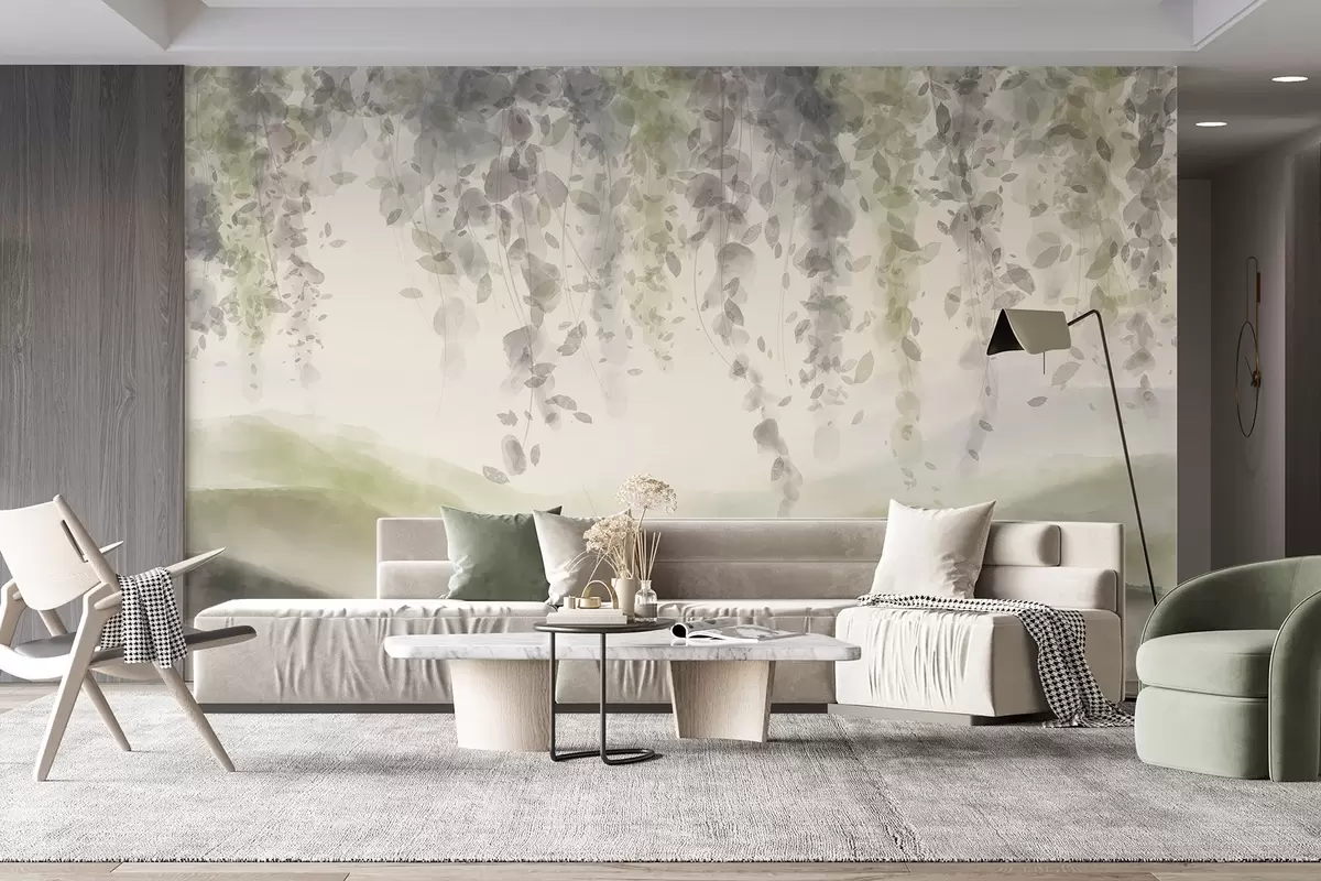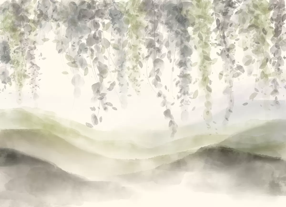 Fototapeedid Wisteria lehed ripuvad üle siniste mägede, pehmed pastellrohelised ja beežid värvid, akvarellstiilis maastik Nr w08909v2