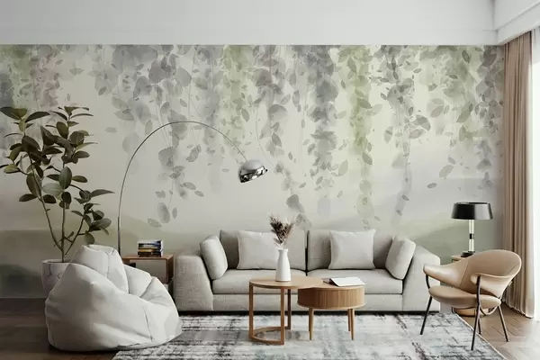 Fototapeedid Wisteria lehed ripuvad üle siniste mägede, pehmed pastellrohelised ja beežid värvid, akvarellstiilis maastik Nr w08909v2