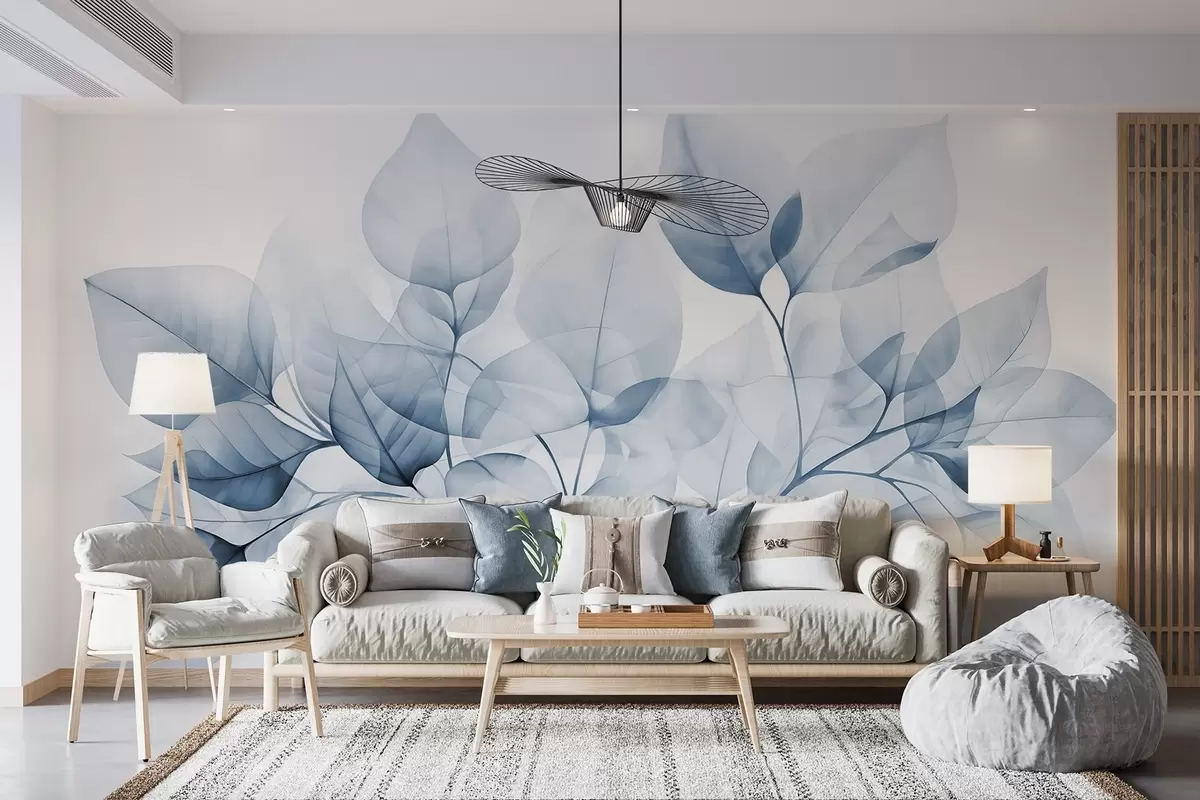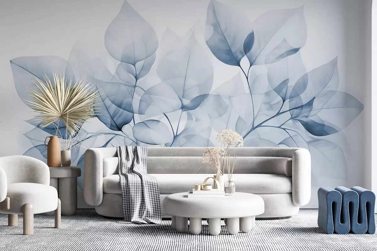 Fototapeedid Akvarellmaal läbikumavate lehtede pastellvärvides, valge ja sinise varjundiga Nr w08910v1