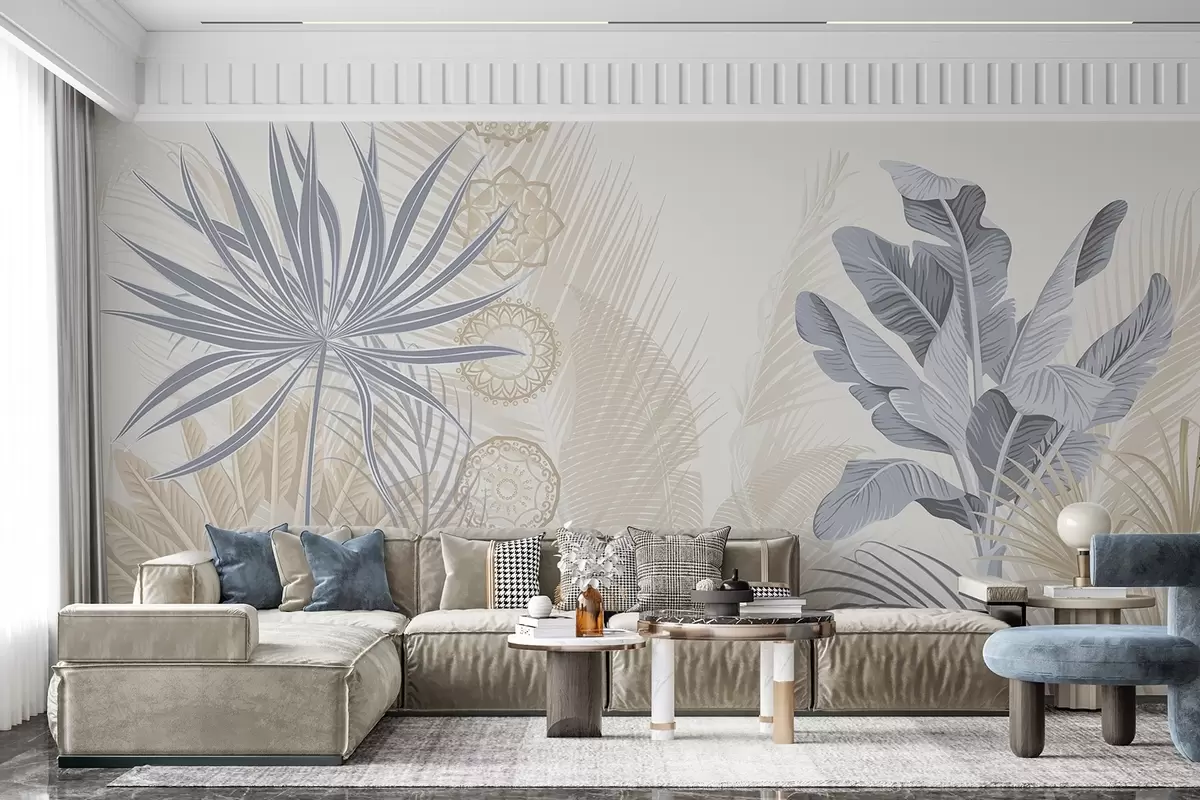 Fototapeedid Troopilised lehed sinistes ja beežides toonides, palmilehed, banaanilehed ja mandala kaunistused, heledal taustal Nr w08913v2