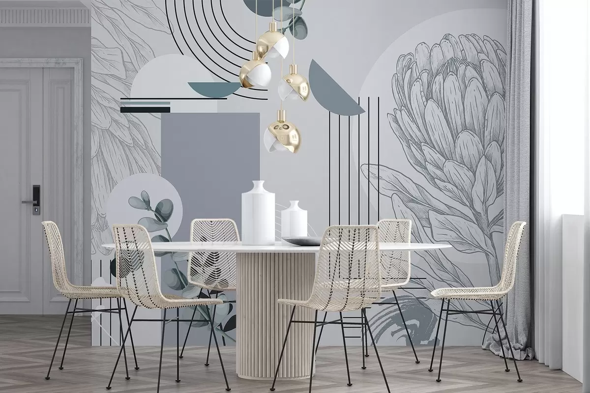 Fototapeedid Abstraktne botaaniline trükis protea lille, eukalüpti lehtedega, geomeetrilised kujundid minimalistlikus stiilis, pastelsed värvid Nr w08914v1