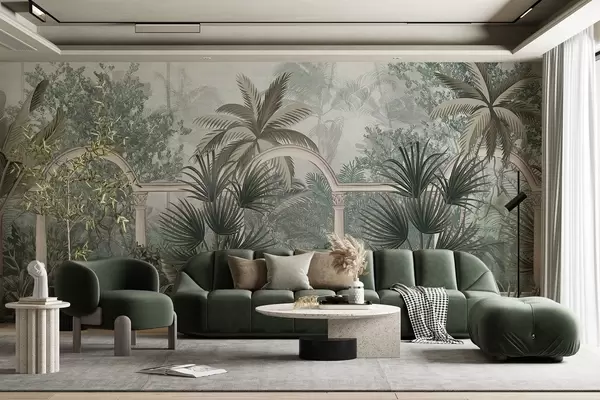 Fototapeedid Troopilise tekstuuriga aed palmipuude ja lopsaka taimestikuga, kaarega balustraad, vaoshoitud värvid, vintage stiilis Nr w08916
