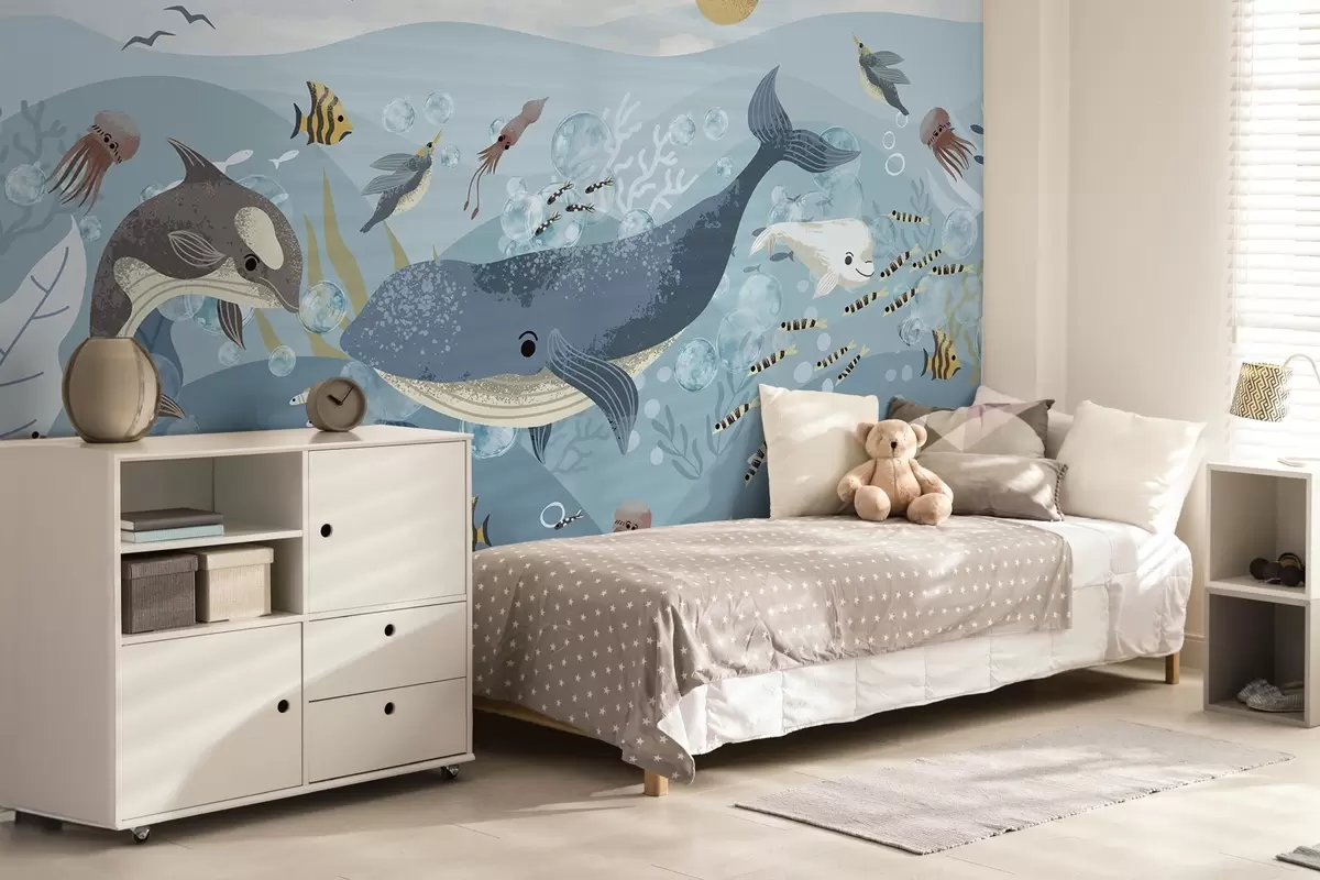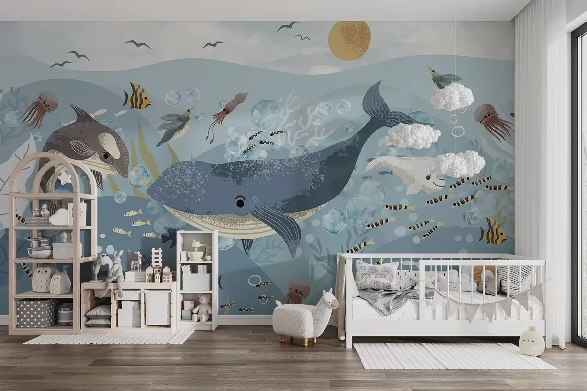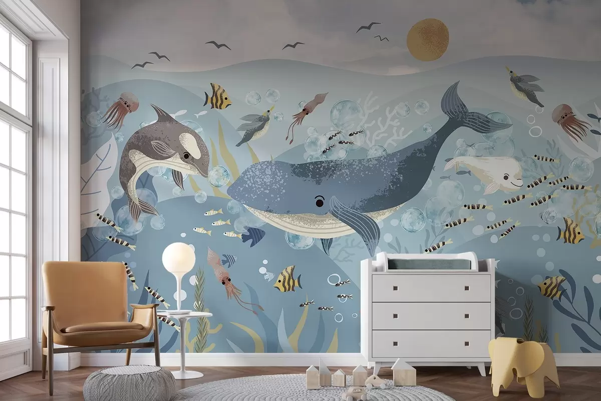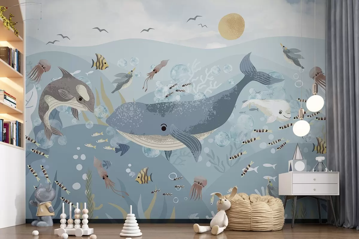 Fototapeedid Laste illustratsioon armas trükis sinise vaalaga, mida ümbritsevad kalad, kalmaarid, meduusid sinises ookeanis koos mullidega Nr w08921