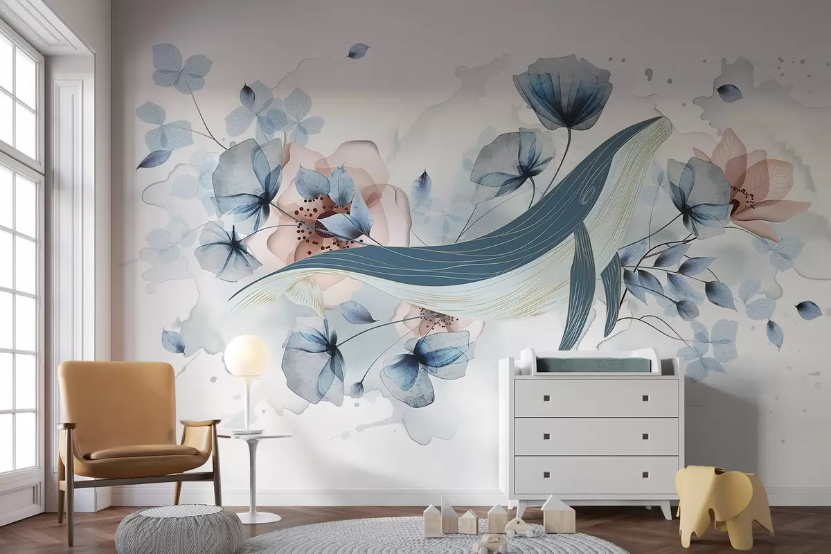 Fototapeedid Sinine vaal koos lilledega, akvarellstiilis, helesinine ja roosa värvid, heledal taustal w08922