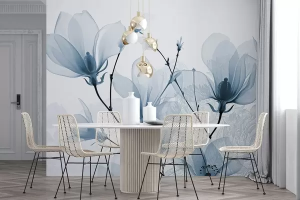 Fototapeedid Läbipaistvad sinised magnoolia lilled koos õrnade kroonlehtede ja tumedate varrega siluettidega Nr w08978