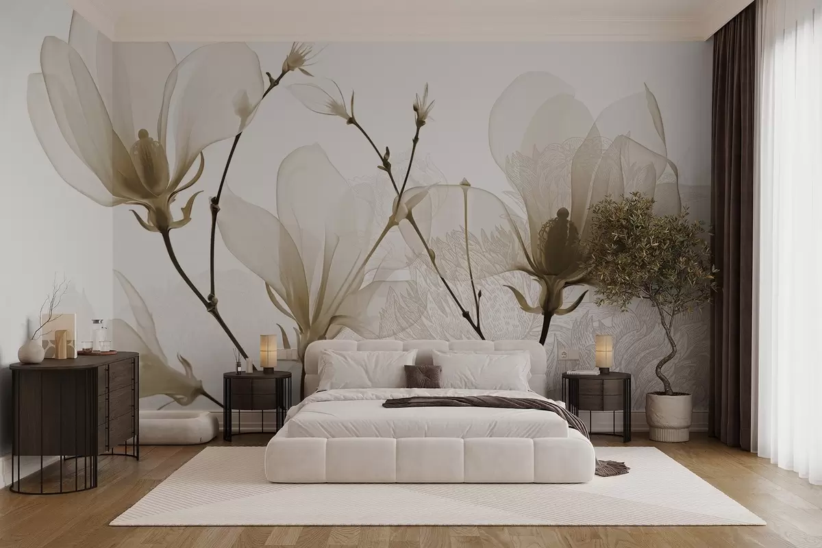 Fototapeedid Läbipaistvad beežid magnoolia lilled, millel on õrnade kroonlehtedega ja tumedate varrega lillede siluette Nr w08978v1