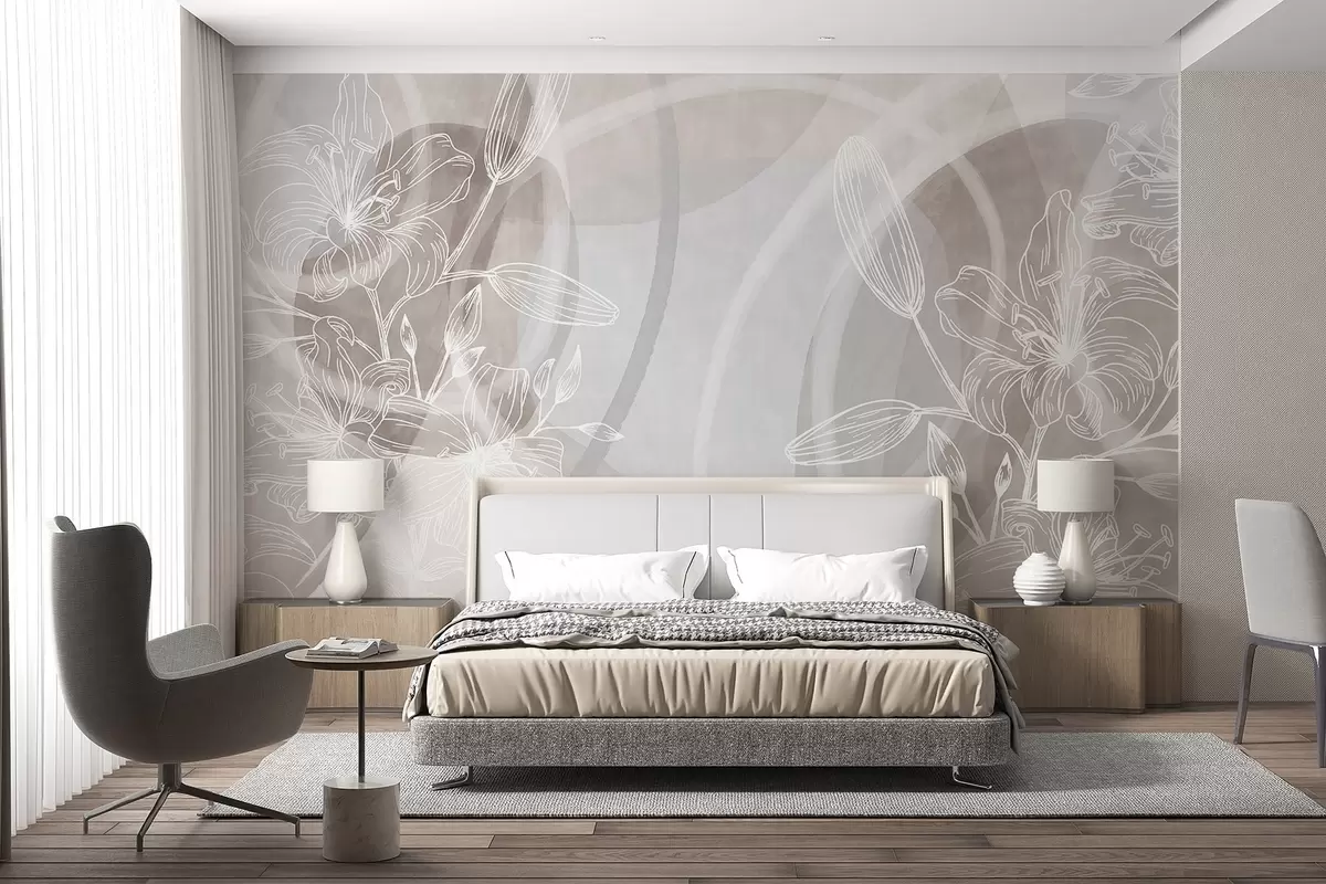 Fototapeedid Minimalistlik lillekujundus valge joonekunsti lillede ja lehtedega, kattuvad abstraktsed ringid beeži ja sinise varjundiga Nr w08979v1