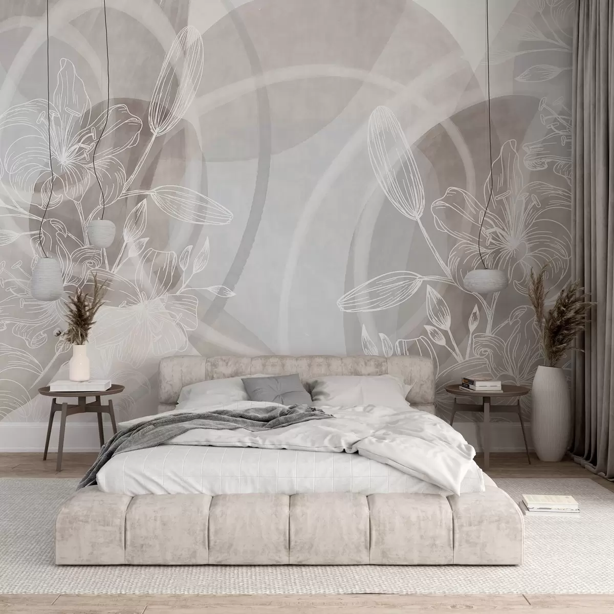 Fototapeedid Minimalistlik lillekujundus valge joonekunsti lillede ja lehtedega, kattuvad abstraktsed ringid beeži ja sinise varjundiga Nr w08979v1