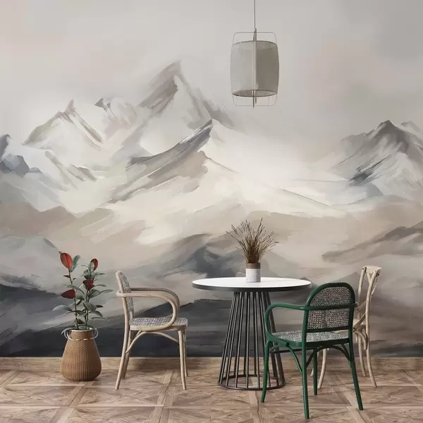 Fototapeedid Mägede maastik heleda taevaga, pintslitõmbed, neutraalsed beežid ja hallid värvid, mäestikuga Nr w08980