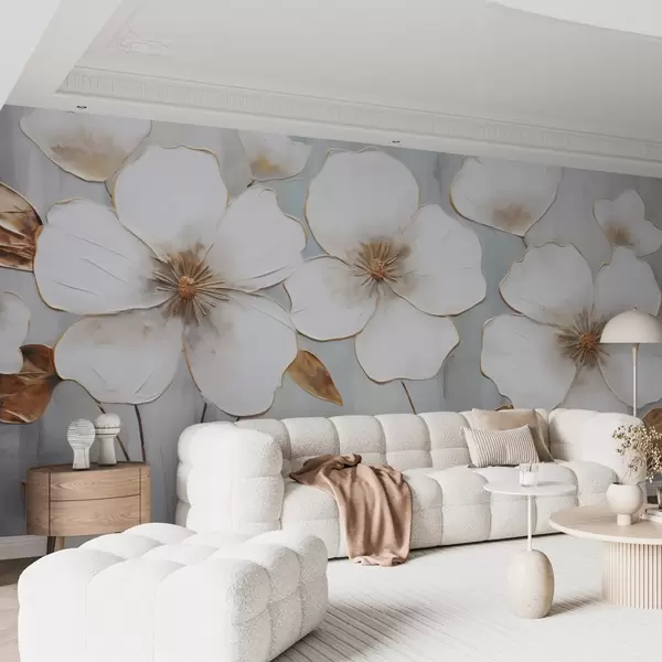 Fototapeedid Suured valged lilled kollase aktsendiga lehed halli taustaga Nr w08999