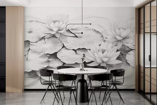 Fototapeedid Vesililled ja lillad tiigis, must-valge pliiatsijoonise jäljendus, detailne botaaniline illustratsioon, looduskunst w09006