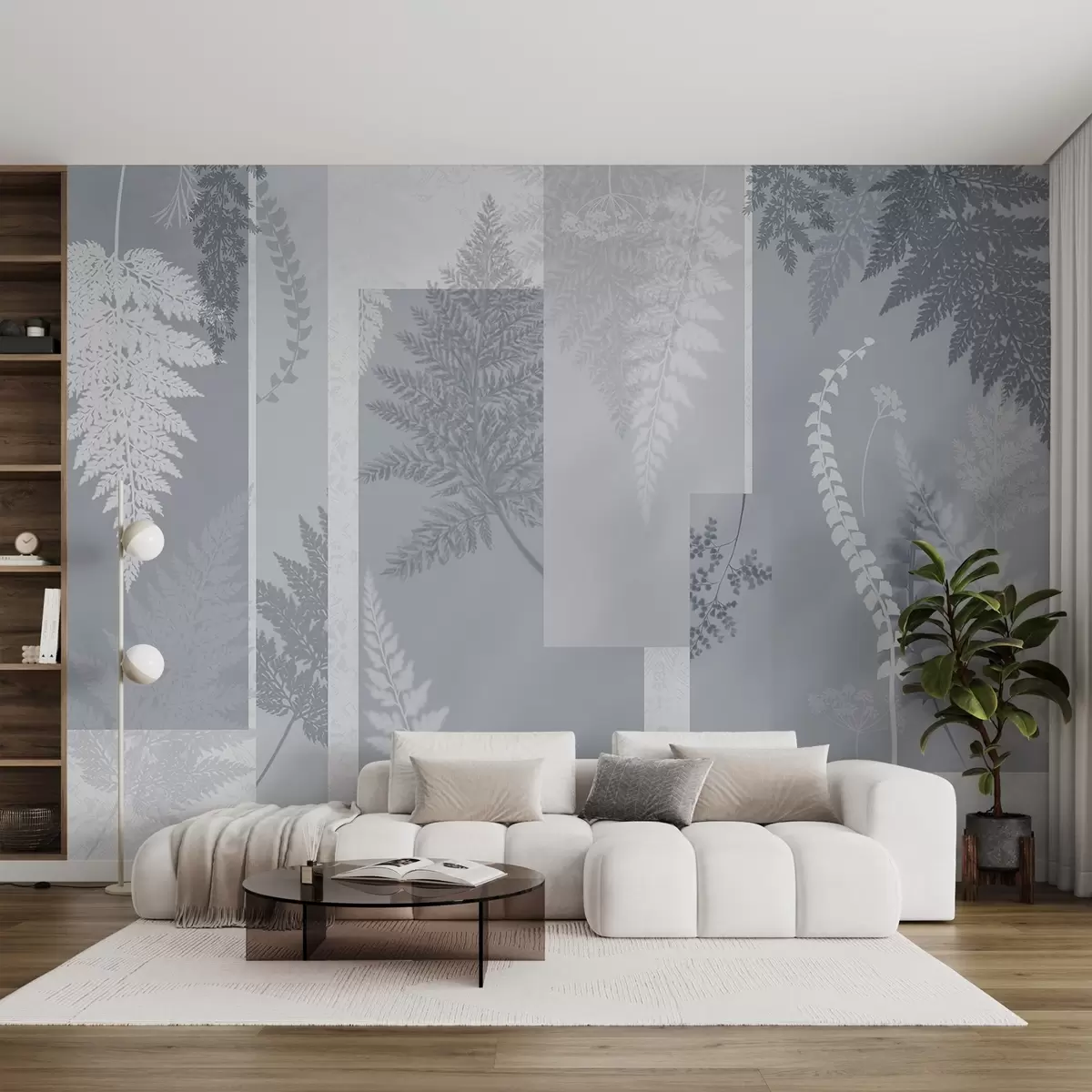 Fototapeedid Sinise ja valge värvi sõnajalgade lehed, mis on paigutatud vertikaalseteks triipudeks, luues botaanilise ja minimalistliku trükise, pehmed ja vaoshoitud värvid Nr w09007v1