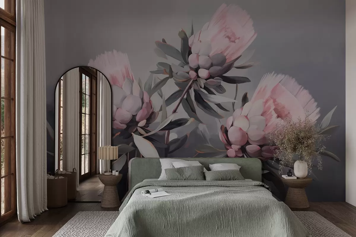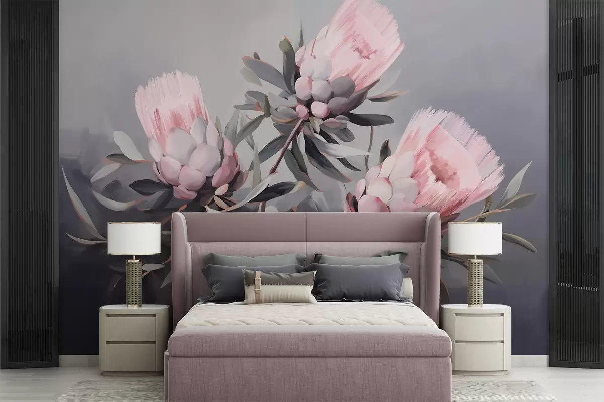 Fototapeedid Roosa protea abstraktsed lilled hallide lehtedega, pehmete tekstuursete pintslitõmmetega, vaoshoitud värvid, hägusel halli taustal Nr w09014