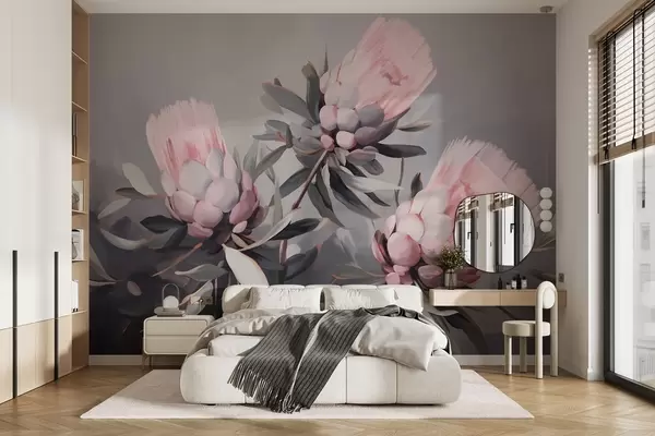 Fototapeedid Roosa protea abstraktsed lilled hallide lehtedega, pehmete tekstuursete pintslitõmmetega, vaoshoitud värvid, hägusel halli taustal Nr w09014