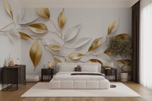 Fototapeedid Kollased ja valged lehed oksal , elegantne disain, valge taust, minimalistlik stiil, dekoratiivne kunst , loodusest inspireeritud Nr w09015