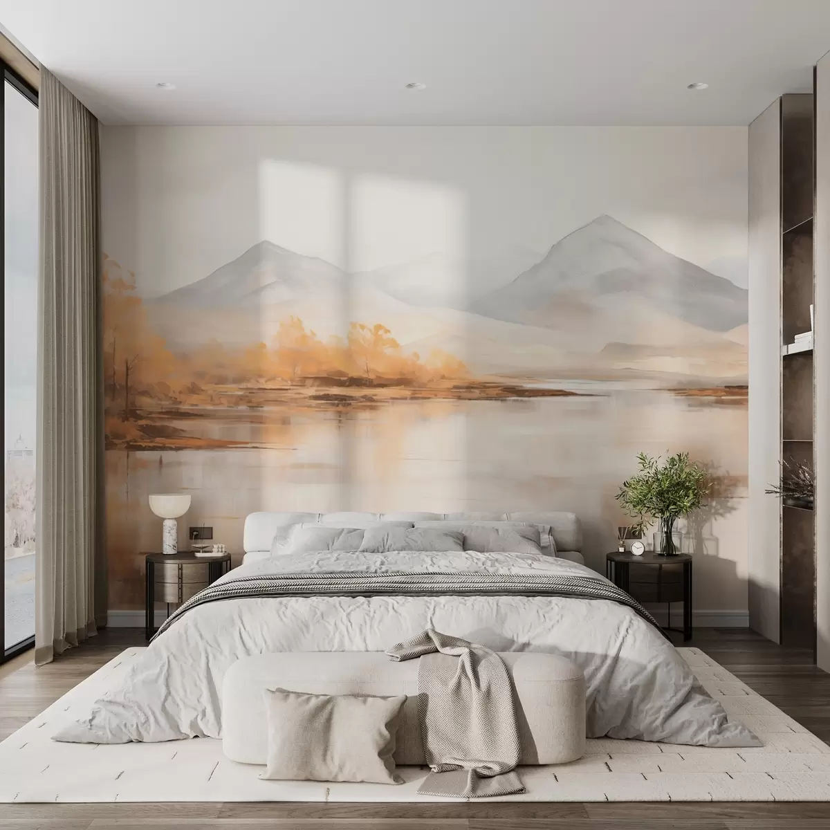 Fototapeedid Sügisene maastik kollaste puude ja jõega mägede taustal Nr w09020