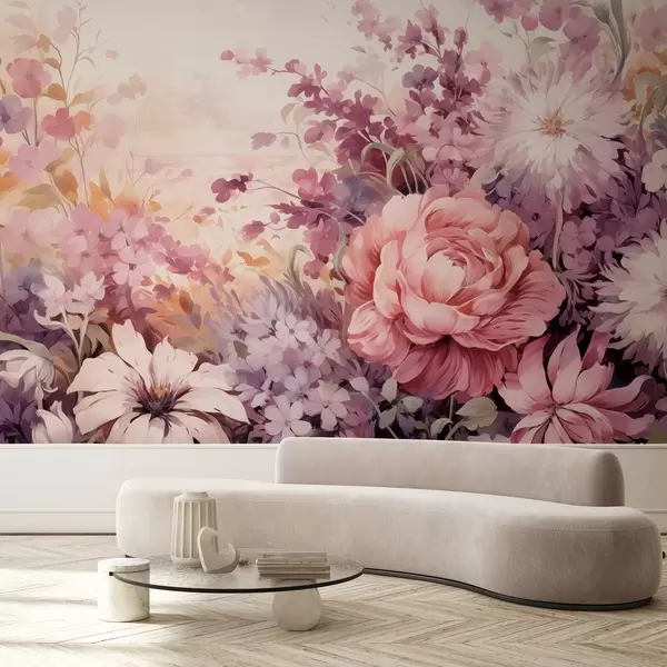 Fototapeedid Värvilised lilled roosa ja lilla toonides: lillad, pioonid, krüsanteemid Nr w09039