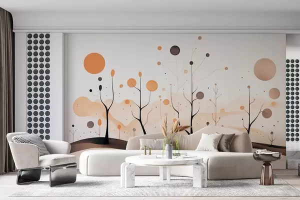 Fototapeedid Abstraktsed puud koos kerade ja päikesega beeži-hallides toonides w09043