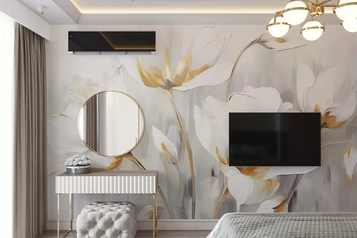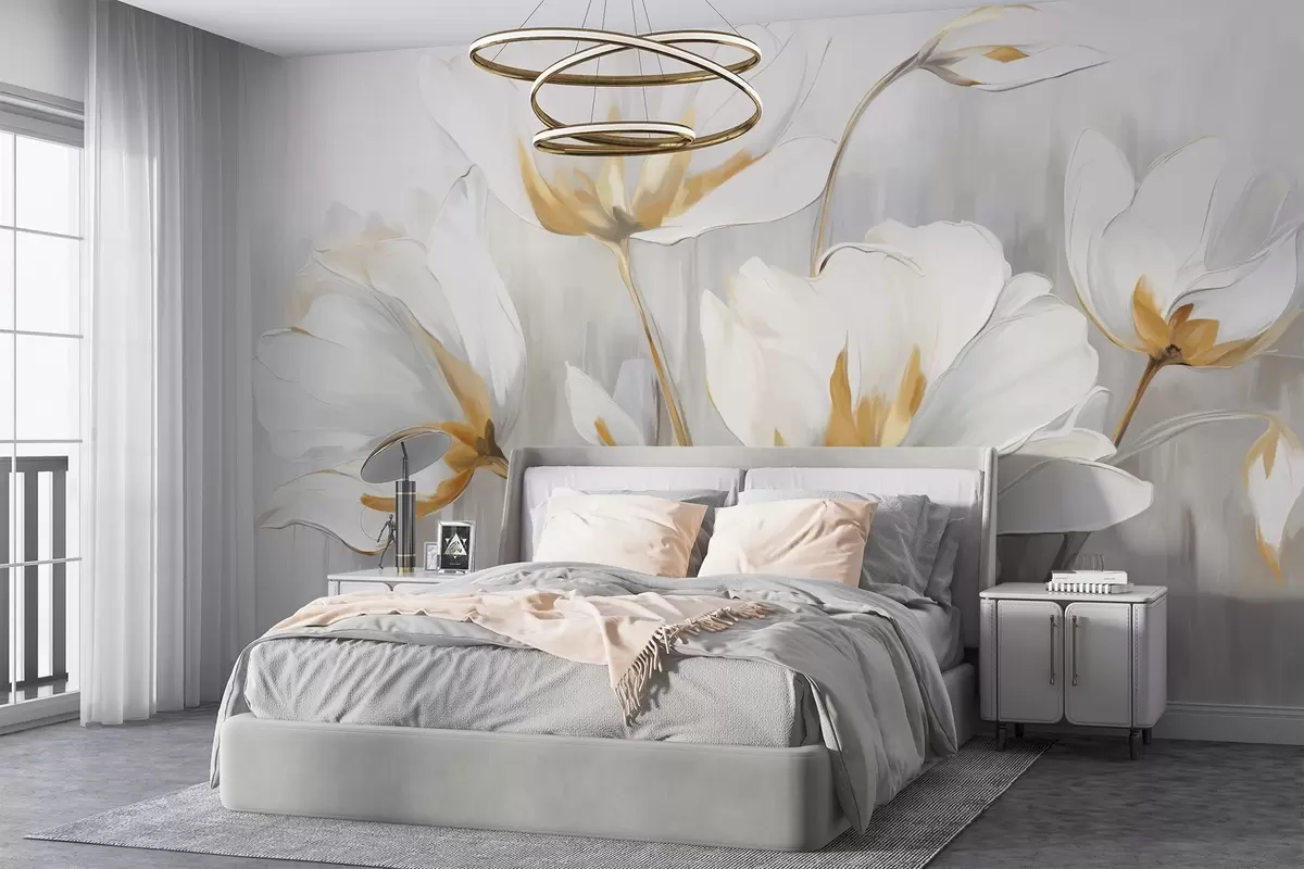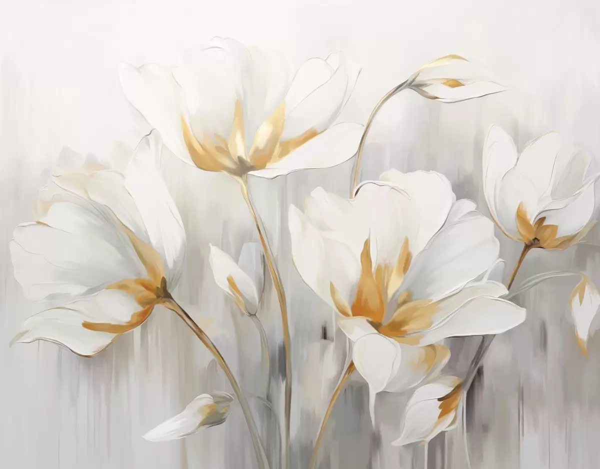 Fototapeedid Valged abstraktsed lilled valgete kroonlehtede ja varrega halli taustaga, millel on hallid ja valged vertikaalsed pintslitõmbed Nr w09047