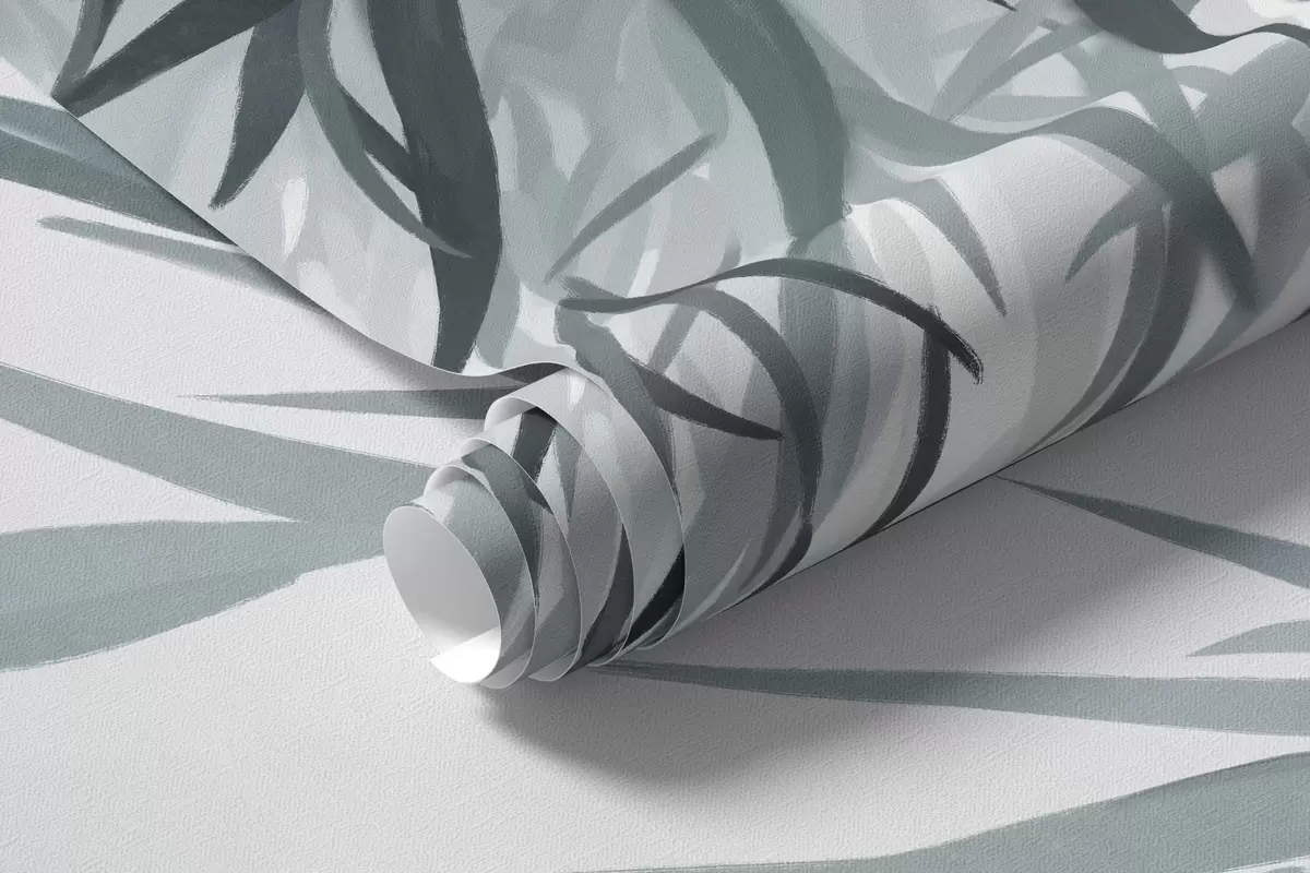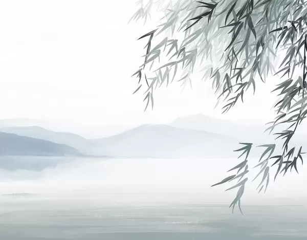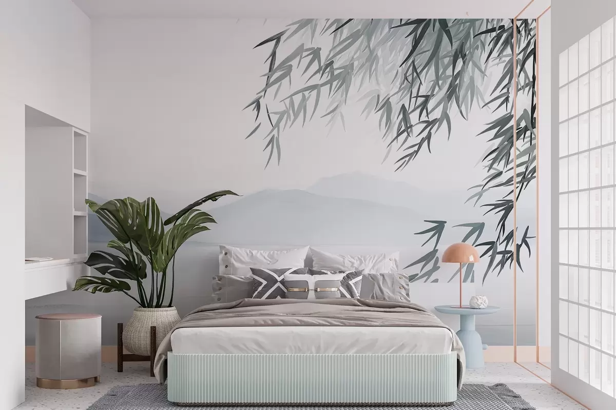 Fototapeedid Bambuslehed rippuvad järve kohal, taustaks mäed, pehmed sinised ja valged toonid, tindipesu stiilis Nr w09048
