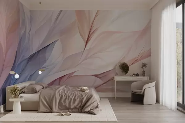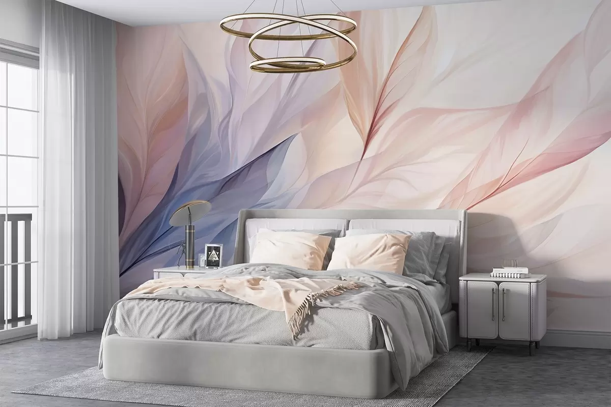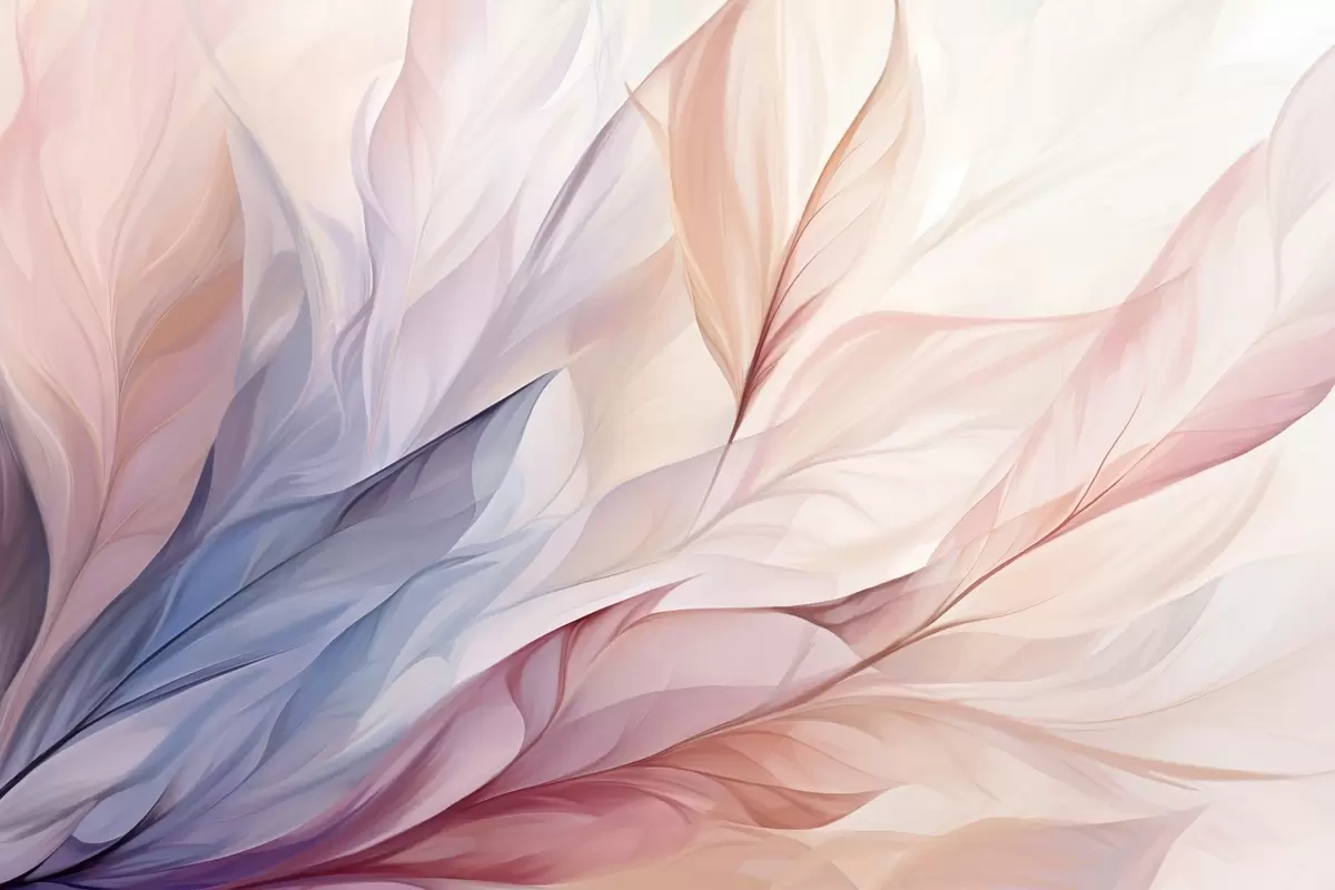 Fototapeedid Abstraktne lillekujundus voolavate kroonlehtedega pastelsetes roosa, virsiku ja sinise toonides, mis loob pehme ja unenäolise kompositsiooni Nr w09049