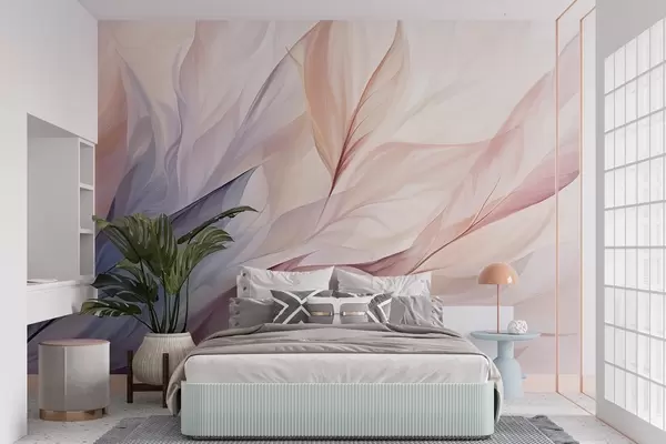 Fototapeedid Abstraktne lillekujundus voolavate kroonlehtedega pastelsetes roosa, virsiku ja sinise toonides, mis loob pehme ja unenäolise kompositsiooni w09049