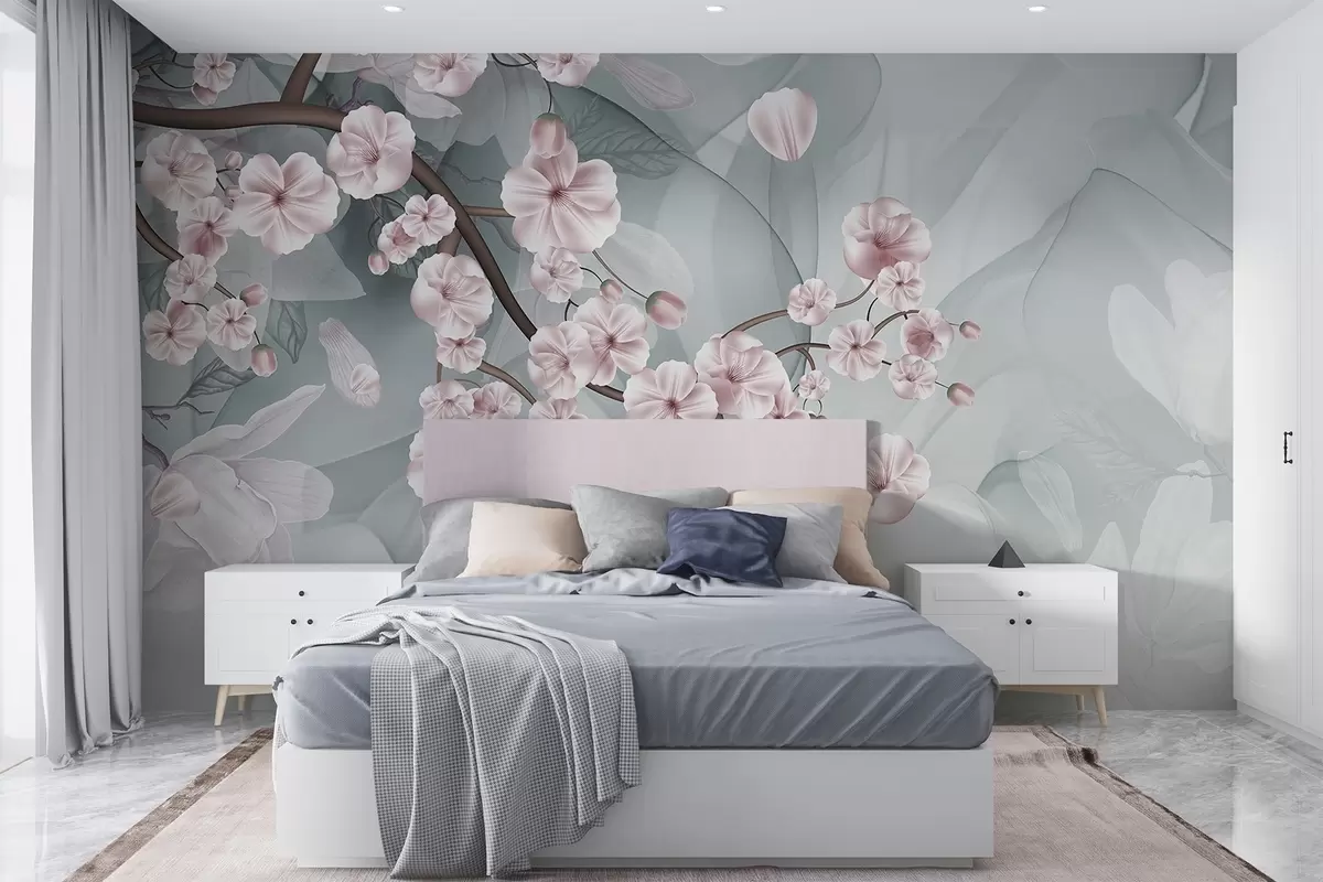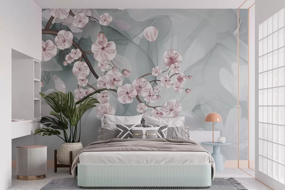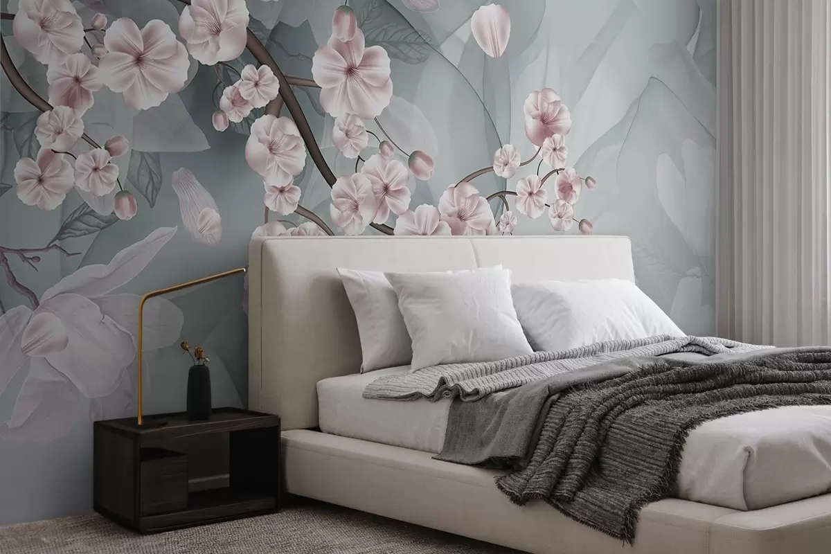 Fototapeedid Kirsiõie oksad roosade õite ja kroonlehtedega, pruunid oksad, abstraktne summutatud taust voolava efektiga Nr w09054