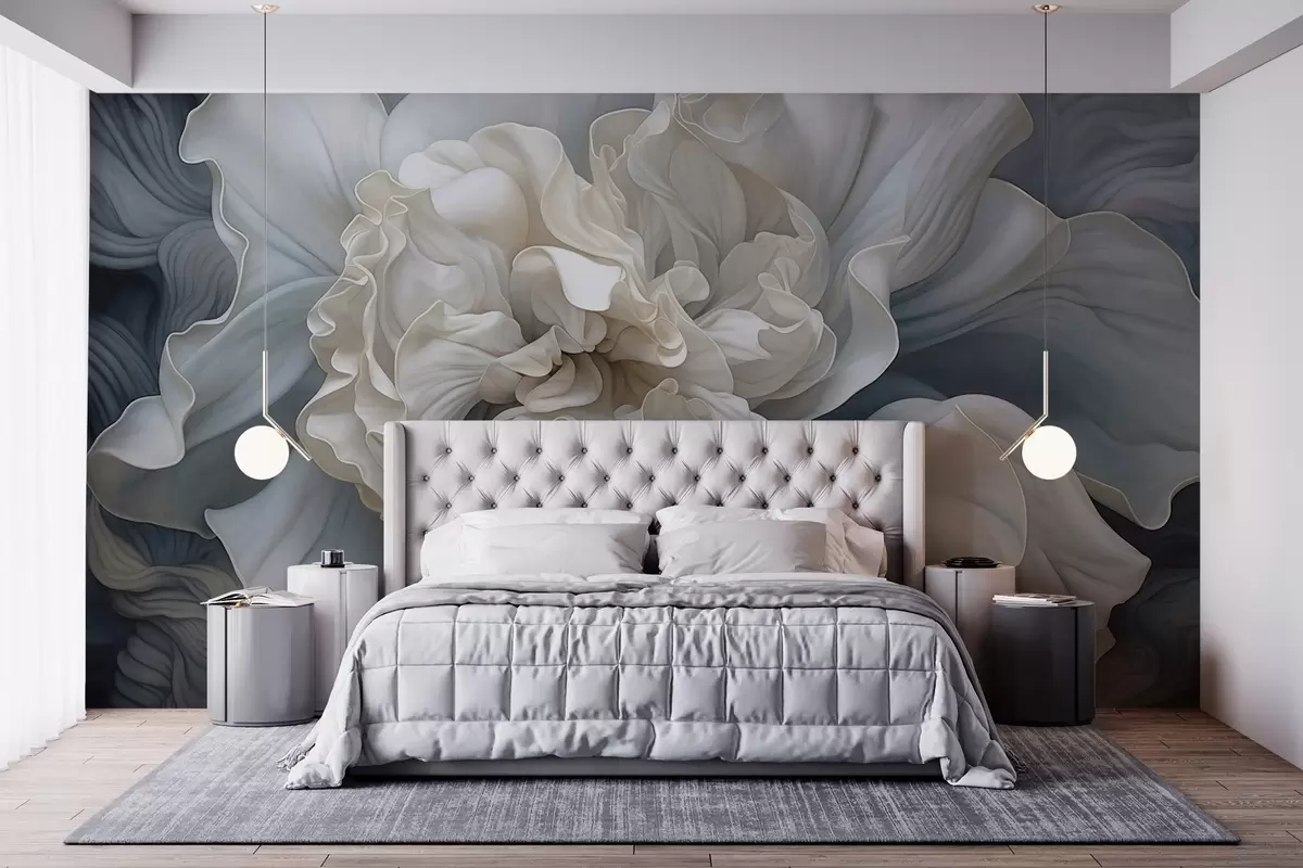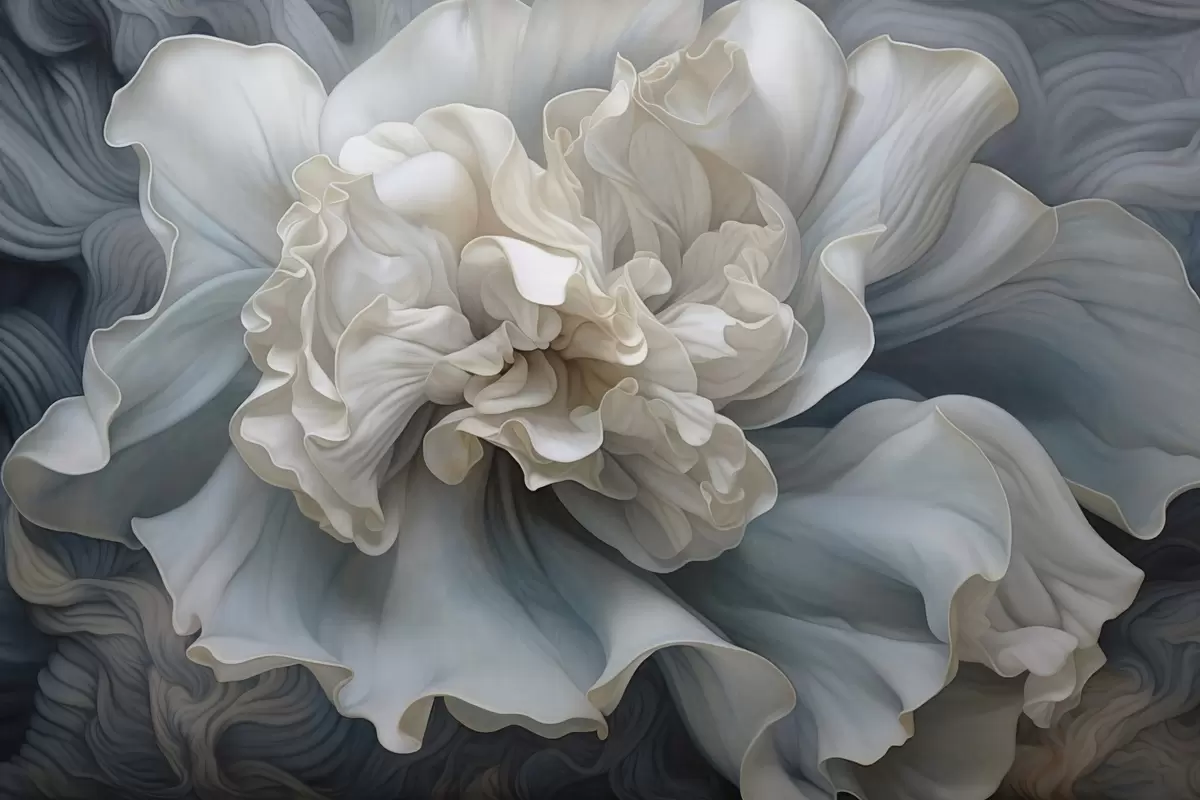Fototapeedid Abstraktne suur dekoratiivne lill paljude kroonlehtedega, pehme ja õrn, taustal sinised ja hallid toonid Nr w09055