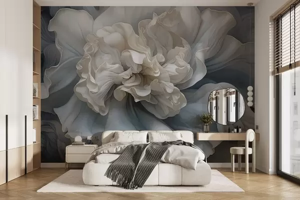 Fototapeedid Abstraktne suur dekoratiivne lill paljude kroonlehtedega, pehme ja õrn, taustal sinised ja hallid toonid Nr w09055