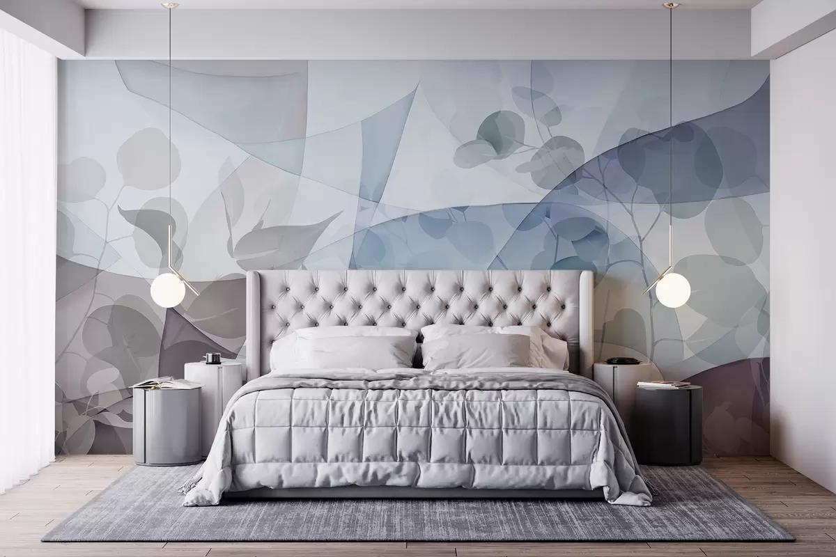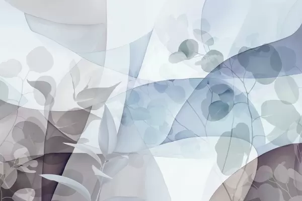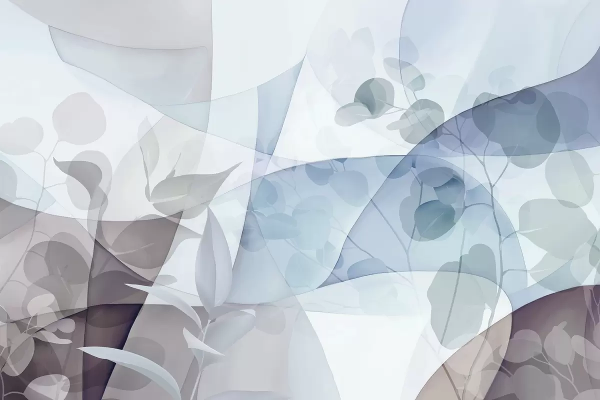 Fototapeedid Abstraktne botaaniline illustratsioon eukalüpti lehtedega ja geomeetriliste kujunditega, mis on pehmete summutatud siniste, pruunide ja valgete värvidega Nr w09061
