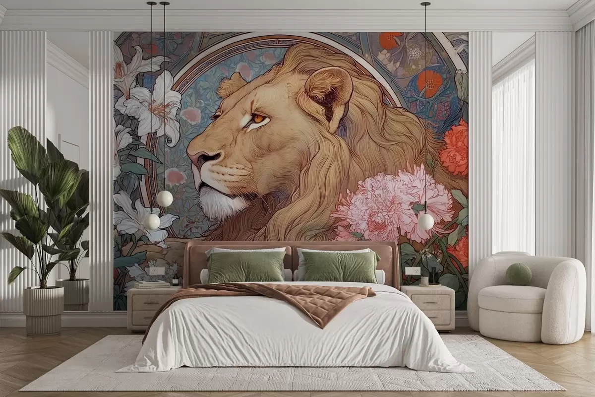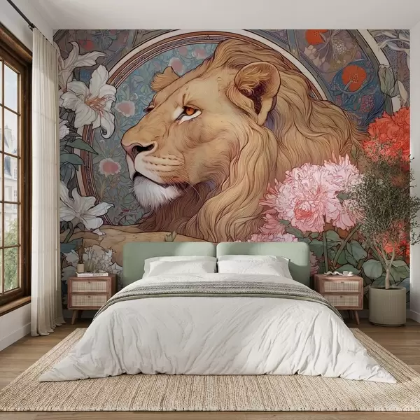 Fototapeedid Paljude lilledega ümbritsetud lõvi Alphonse Mucha stiilis Nr w09073