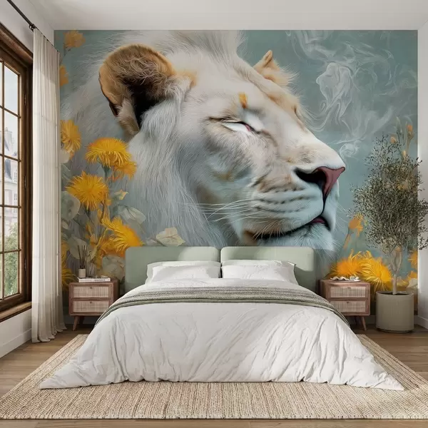 Fototapeedid Valge lõvi ümbritsetud kollaste lillede ja suitsuga Nr w09080