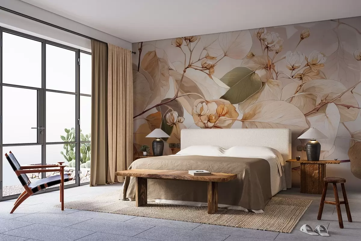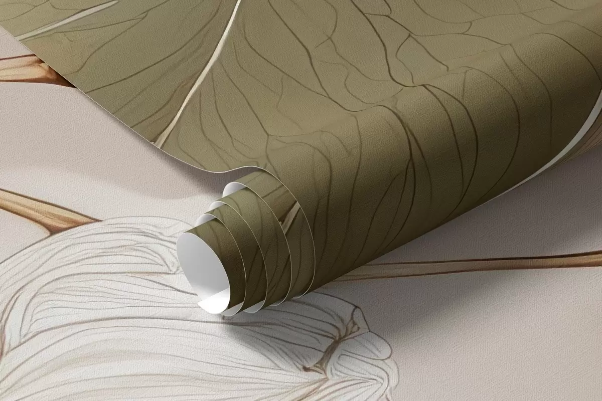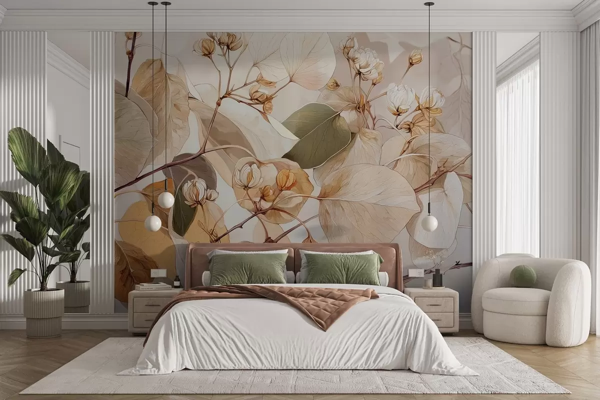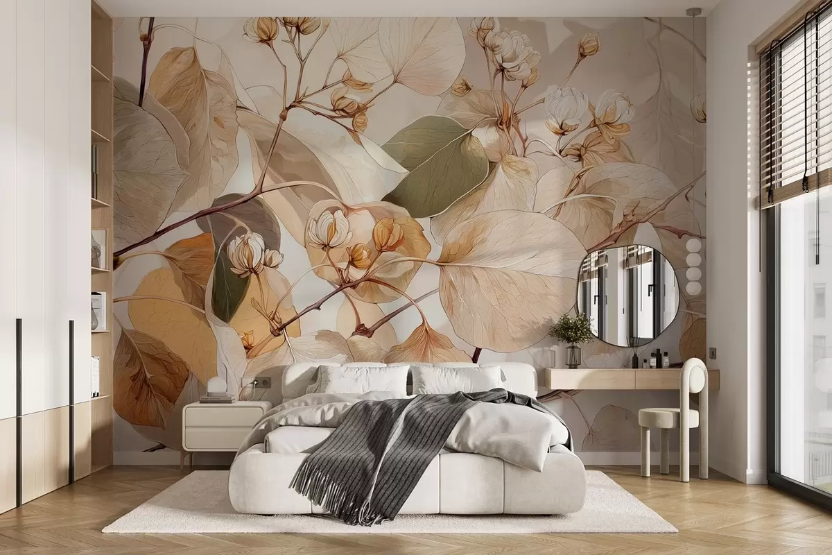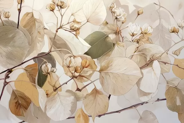 Fototapeedid Oksad haava lehed ja lilled õlimaal stiilis beežides toonides Nr w09082