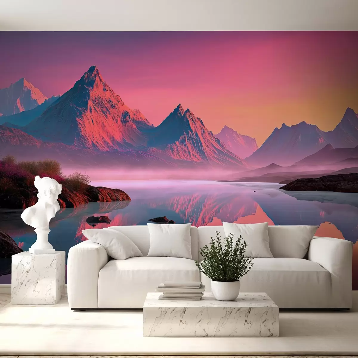 Fototapeedid Romantiline päikeseloojangu maastik jõe ja roosade toonidega mägedega Nr w09093