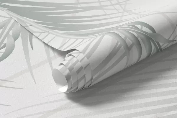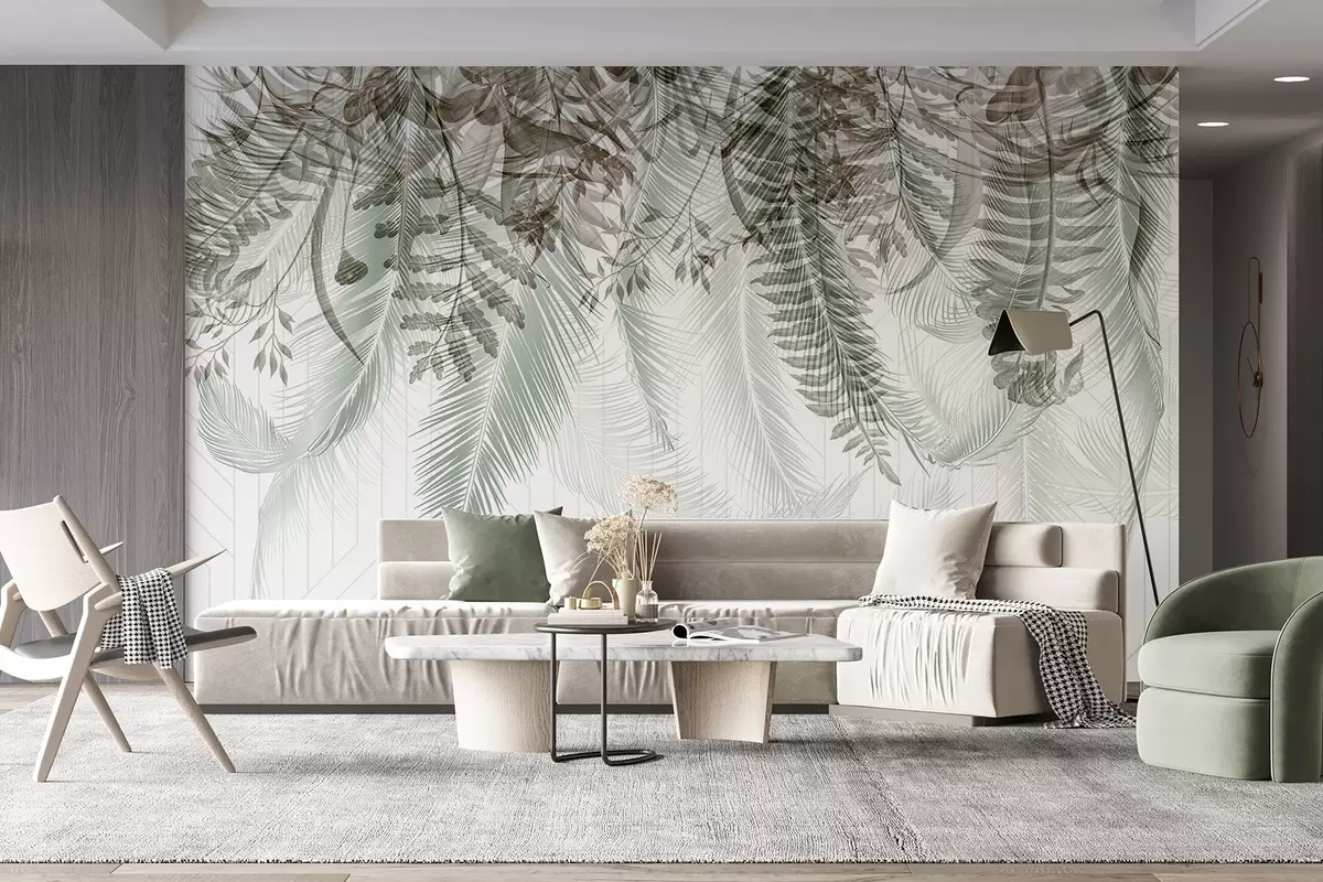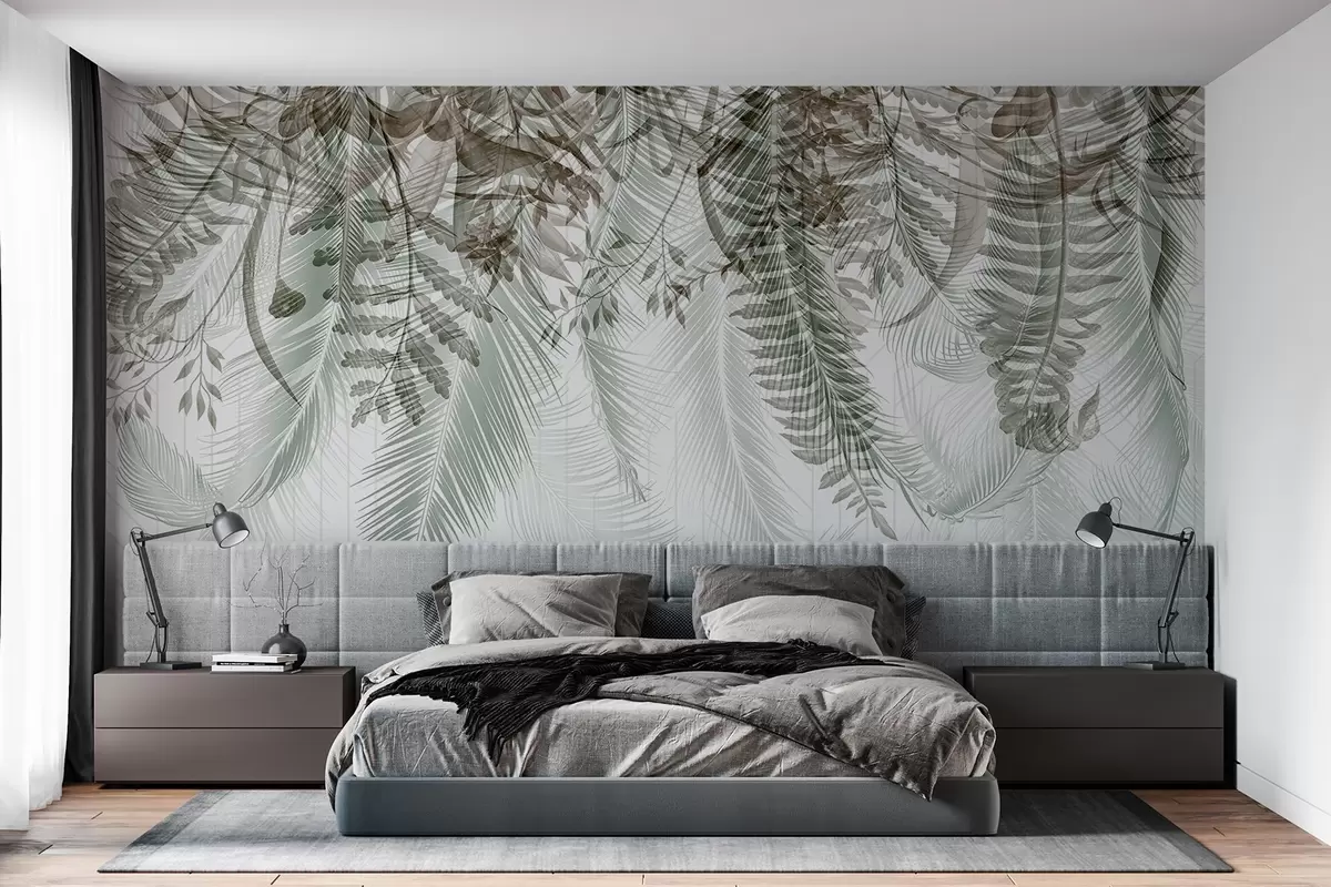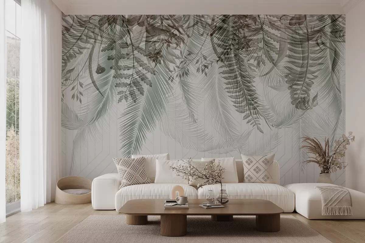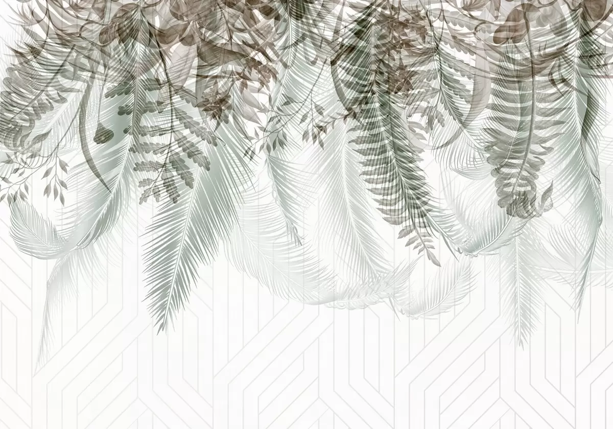 Fototapeedid Delikaatne langev troopiline sõnajalg ja palmilehed, geomeetriline taust, pehme valgus, vaoshoitud värvid, elegantne Nr w09106v1