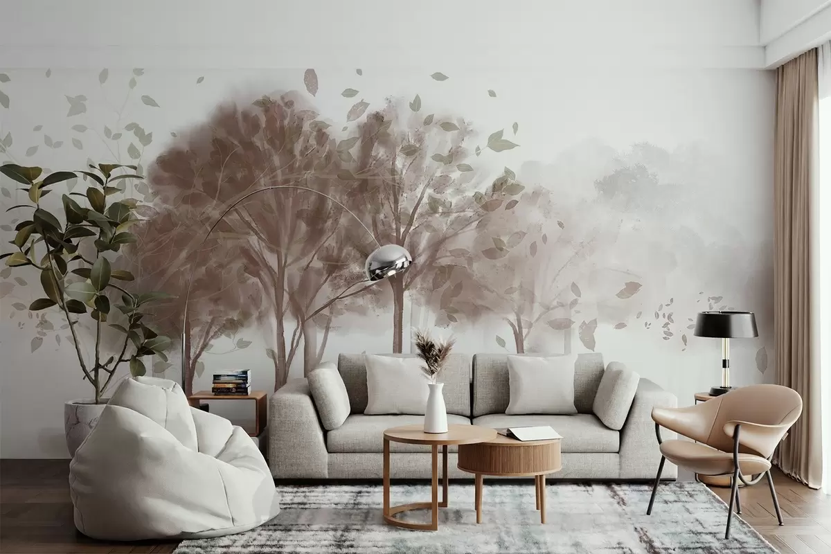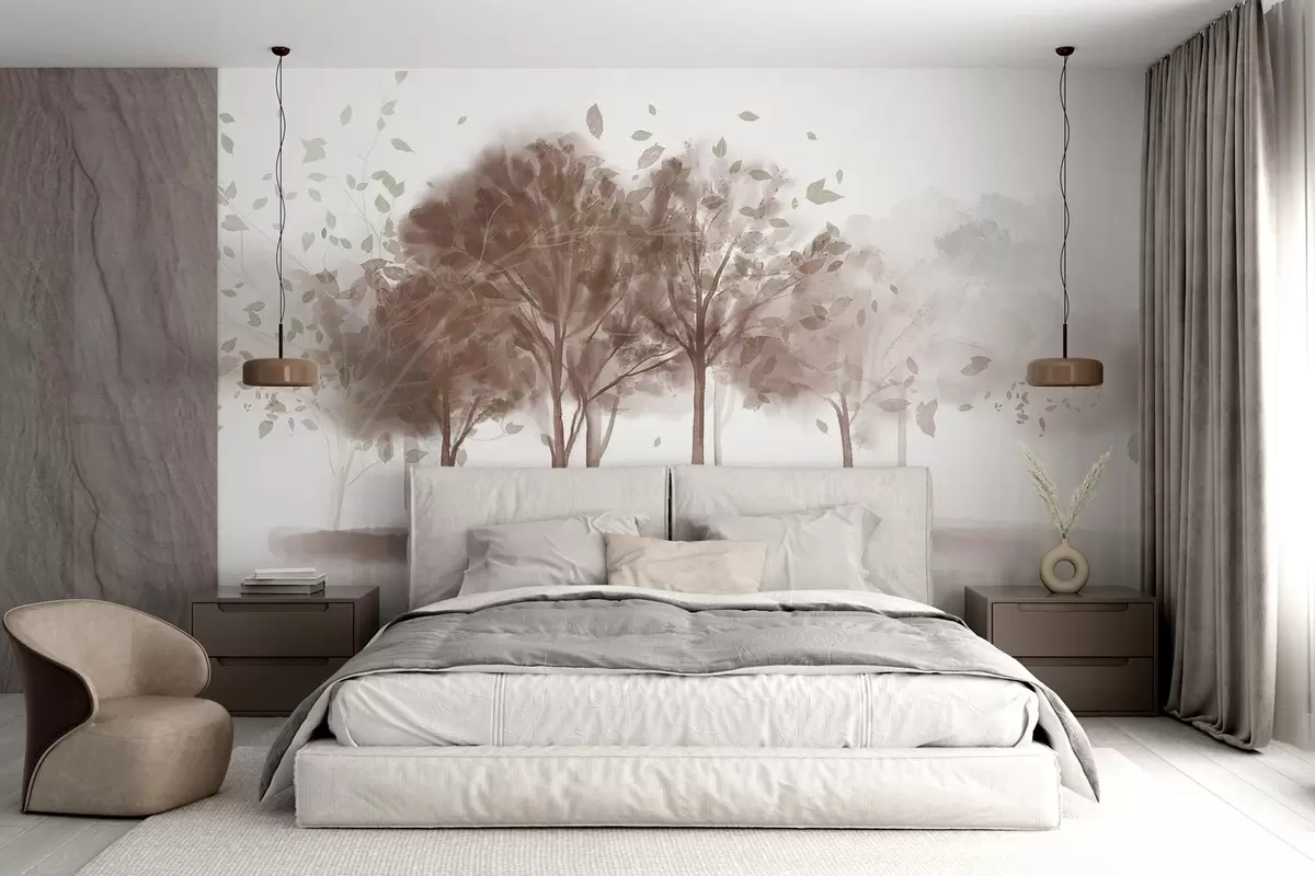 Fototapeedid Abstraktne maastik, kus puud koos pruunide lehtedega peegelduvad vees, akvarelliga tekstuurses stiilis Nr w09109v1