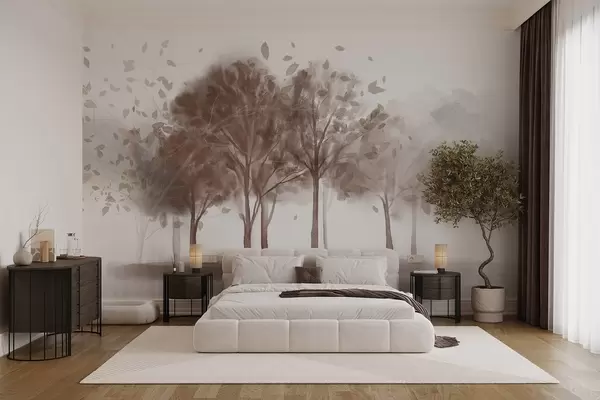 Fototapeedid Abstraktne maastik, kus puud koos pruunide lehtedega peegelduvad vees, akvarelliga tekstuurses stiilis Nr w09109v1