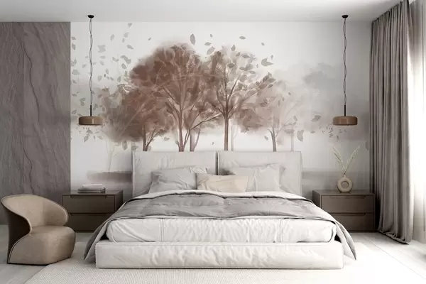 Fototapeedid Abstraktne maastik, kus puud koos pruunide lehtedega peegelduvad vees, akvarelliga tekstuurses stiilis w09109v1