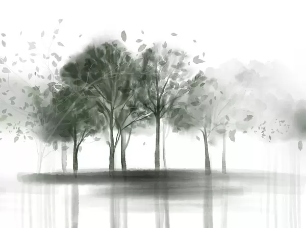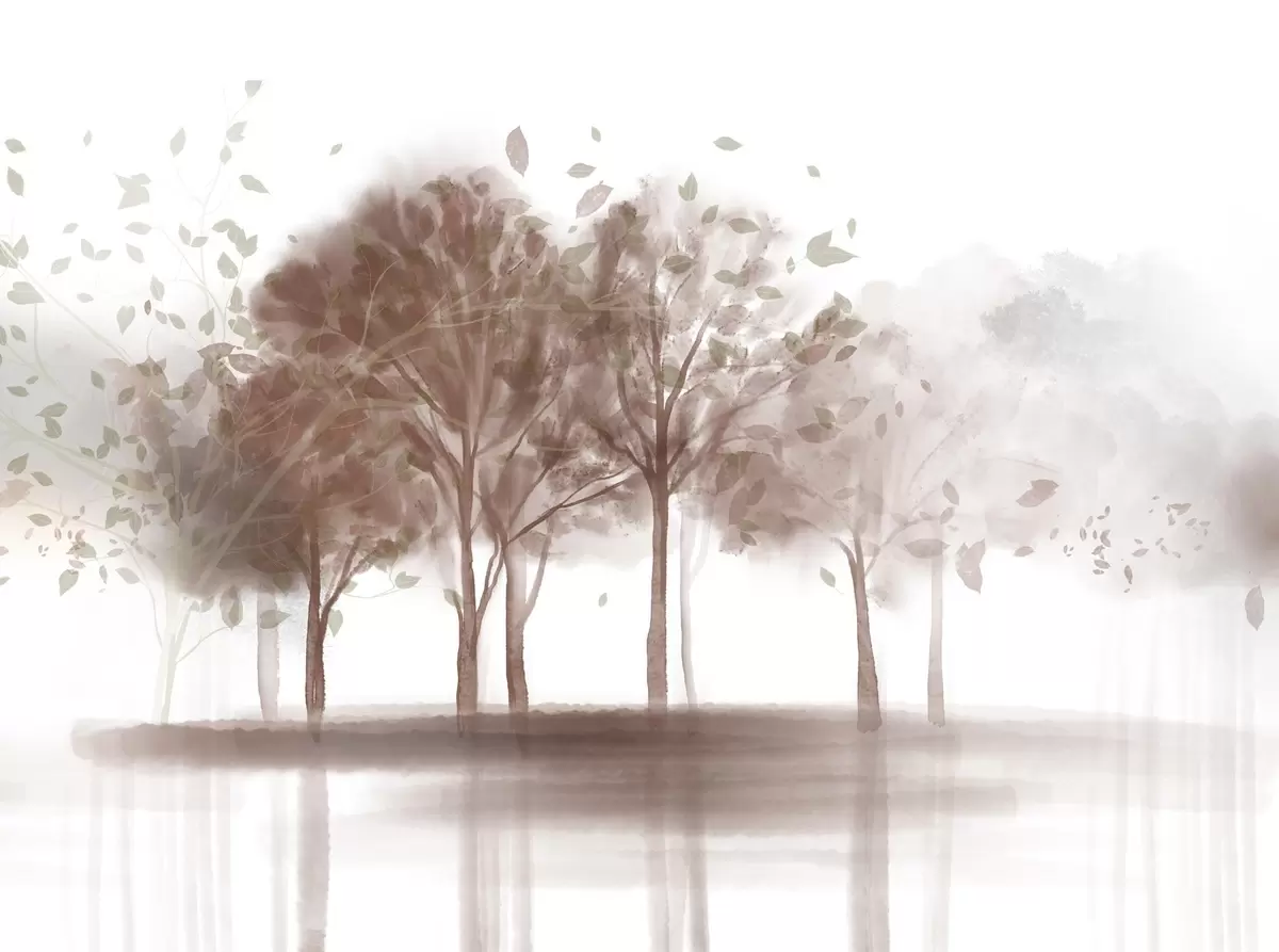 Fototapeedid Abstraktne maastik, kus puud koos pruunide lehtedega peegelduvad vees, akvarelliga tekstuurses stiilis Nr w09109v1