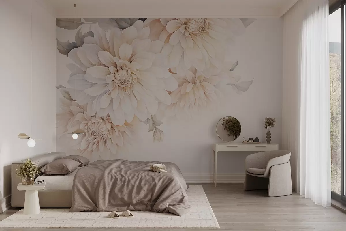 Fototapeedid Pehme, õrna virsiku ja valgete heledate kroonlehtedega pastelsed daaliad akvarellistiilis, pehme taustaga Nr w09115