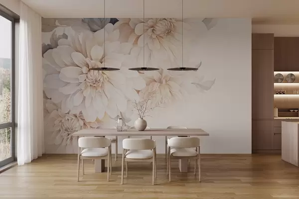 Fototapeedid Pehme, õrna virsiku ja valgete heledate kroonlehtedega pastelsed daaliad akvarellistiilis, pehme taustaga Nr w09115