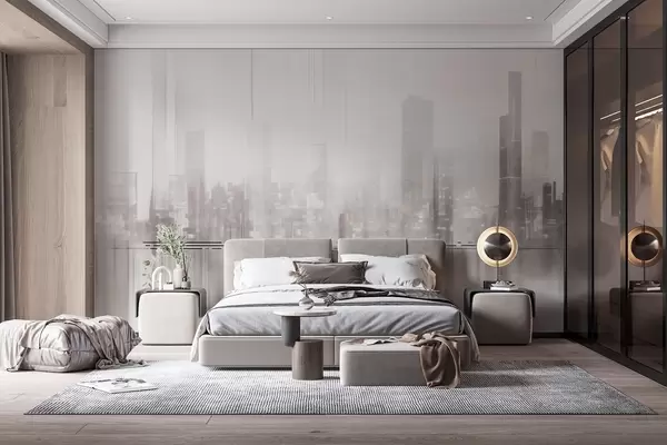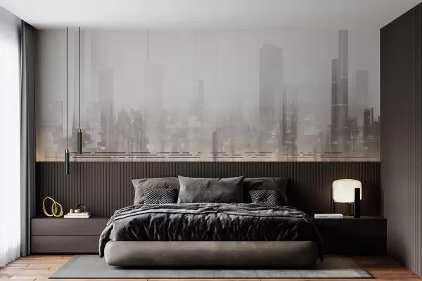 Fototapeedid Abstraktne tekstuurne linnapilt kõrgete hoonete ja ribadega, halli ja valge toonides, mis tekitab uduse efekti Nr w09119