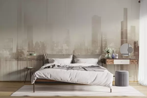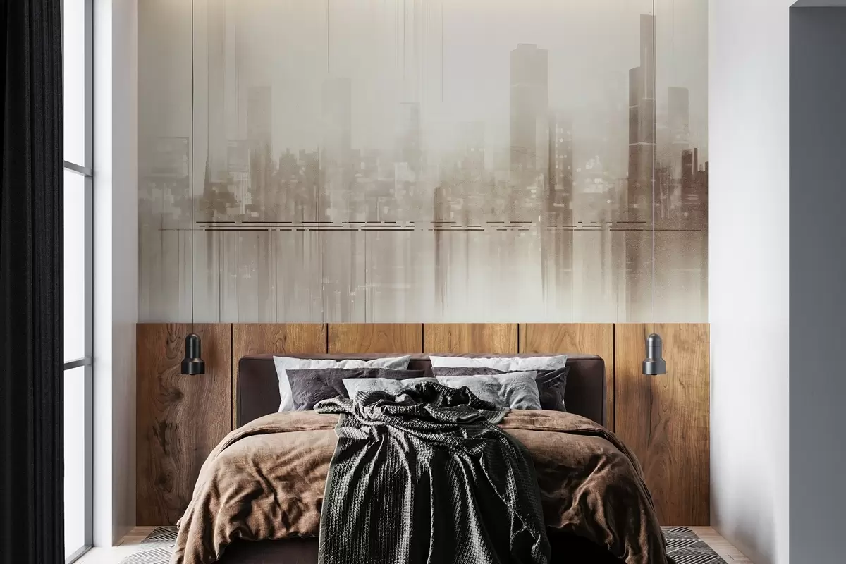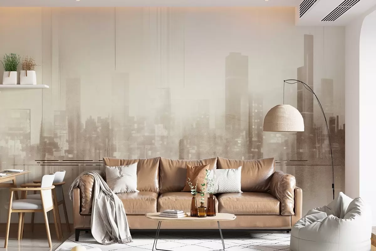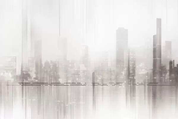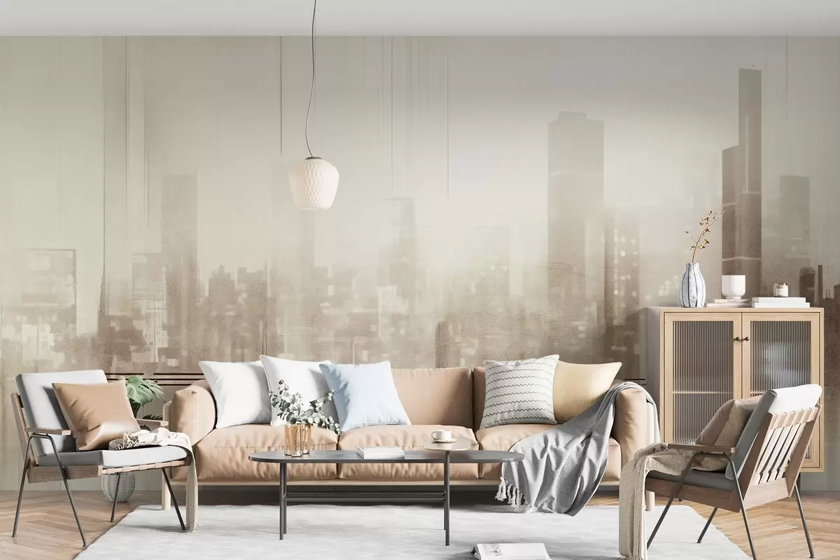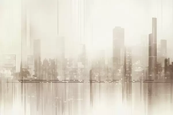Fototapeedid Abstraktne tekstuurne linnapilt kõrgete hoonete ja ribadega, beeži ja valge toonides, mis tekitab uduse efekti Nr w09119v1