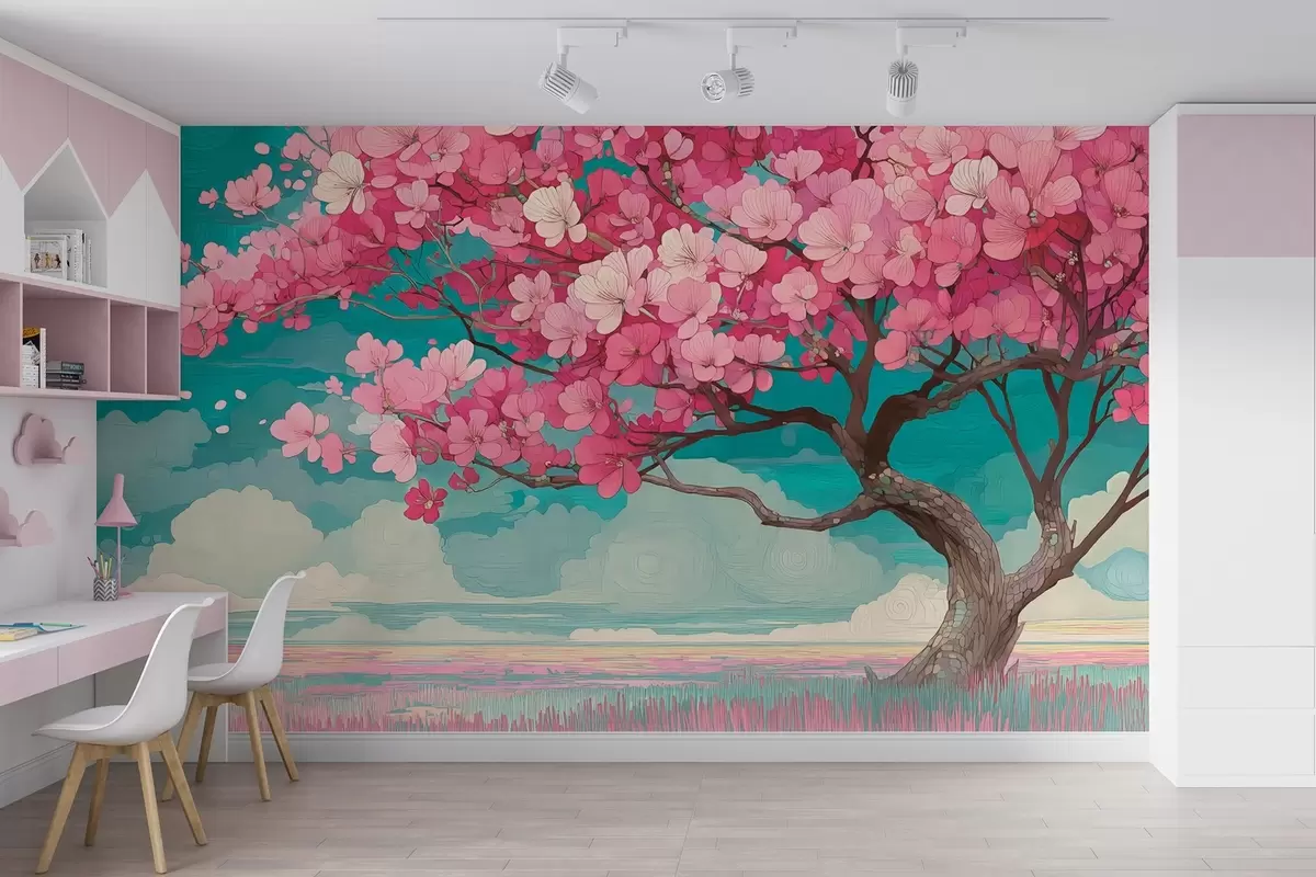 Fototapeedid Roosa kirsiõiepuu langevate kroonlehtedega ja sinine taevas romantilises stiilis Nr w09120